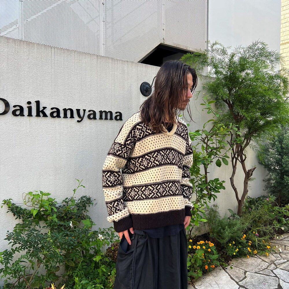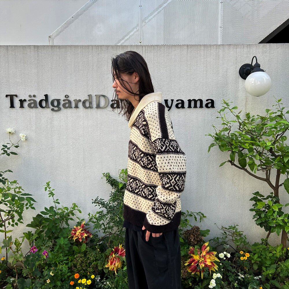 70s Nordic Sweater The 2-tone Nordic pattern of off-white and black has a shawl collar design that creates a sense of volume, creating a great atmosphere.100% wool knit with a tight texture.Not too big, just the right amount of room. This item has a good size and a very good silhouette.