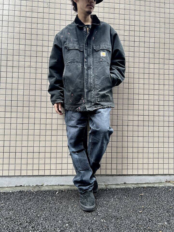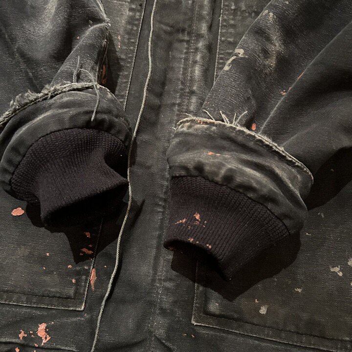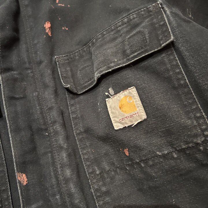 Carhartt, traditional coat from the early 2000s. The front pocket is integrated into the Carhartt-like design, and the rare black body has a realistic work feel and aged appearance, and the spattered paint is also a nice accent. The loose size and soft duck fabric make the silhouette fall naturally to the shoulders. Quality: Cotton Color: Black SIZE: 44 [Size] Shoulder width: 60cm Body width: 70cm Sleeve length: 63cm Length: 77cm [Model size] Height: 175cm Shoulder width: 44cm B (chest): 85cm W (waist): 71cm Rare as it is an old item There is some deterioration over time. We try to make the product photos as close to the actual color as possible, but the color may differ from the actual product depending on your monitor settings, room lighting, etc. Please check the photos and understand the vintage characteristics before purchasing. *Please see here for the measurement method.