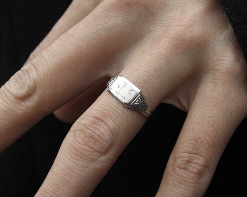 A signet ring from the 1930s. An elegant piece with a rugged rectangular top and side work. The dull silver texture and minimalist structure give it an antique feel. Although the engraving has disappeared, it is sterling silver. Please check the condition in the photo and understand the vintage characteristics before purchasing.