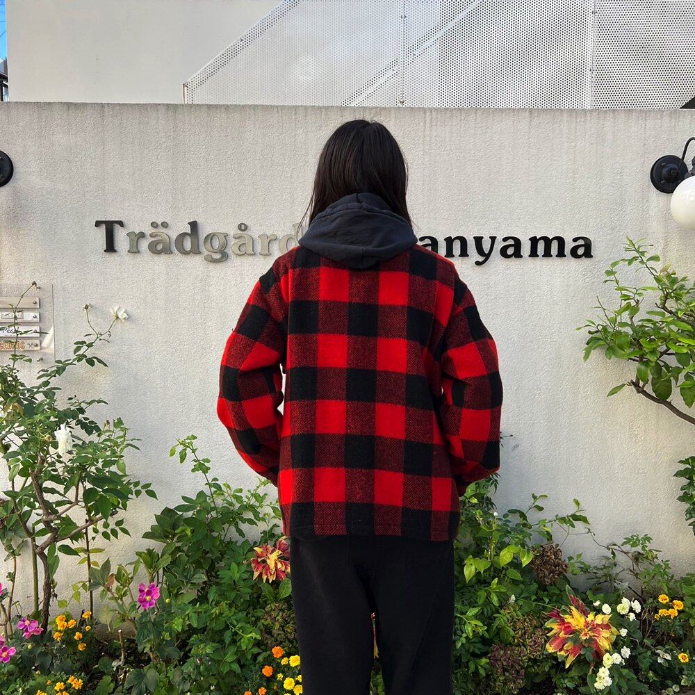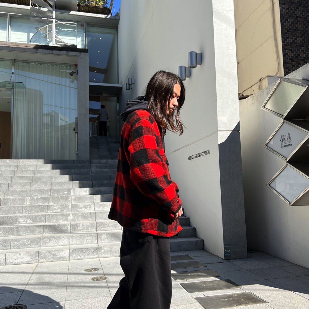 A 60s CPO jacket with bright red and black buffalo check.Its a moderately loose size and has a great silhouette.Its made of thick 100% wool fabric and has a sporty front zip design.