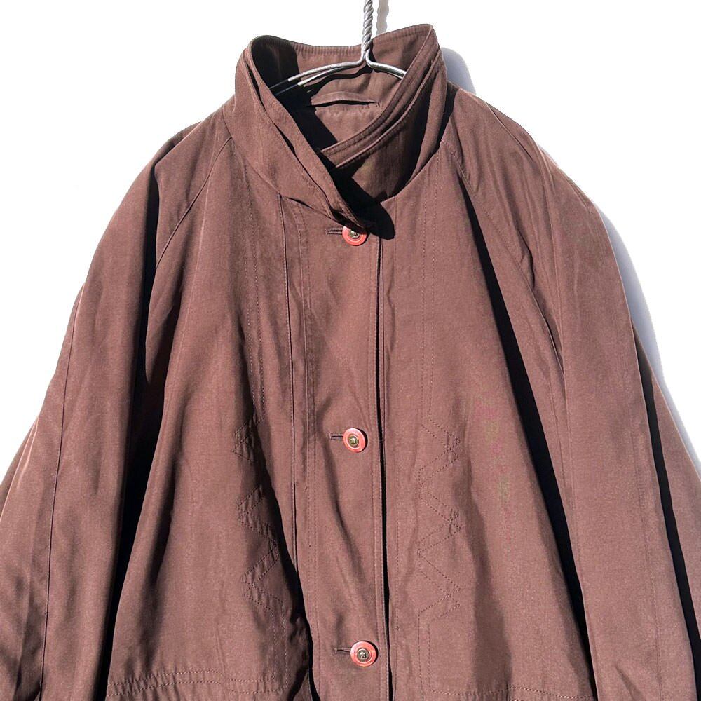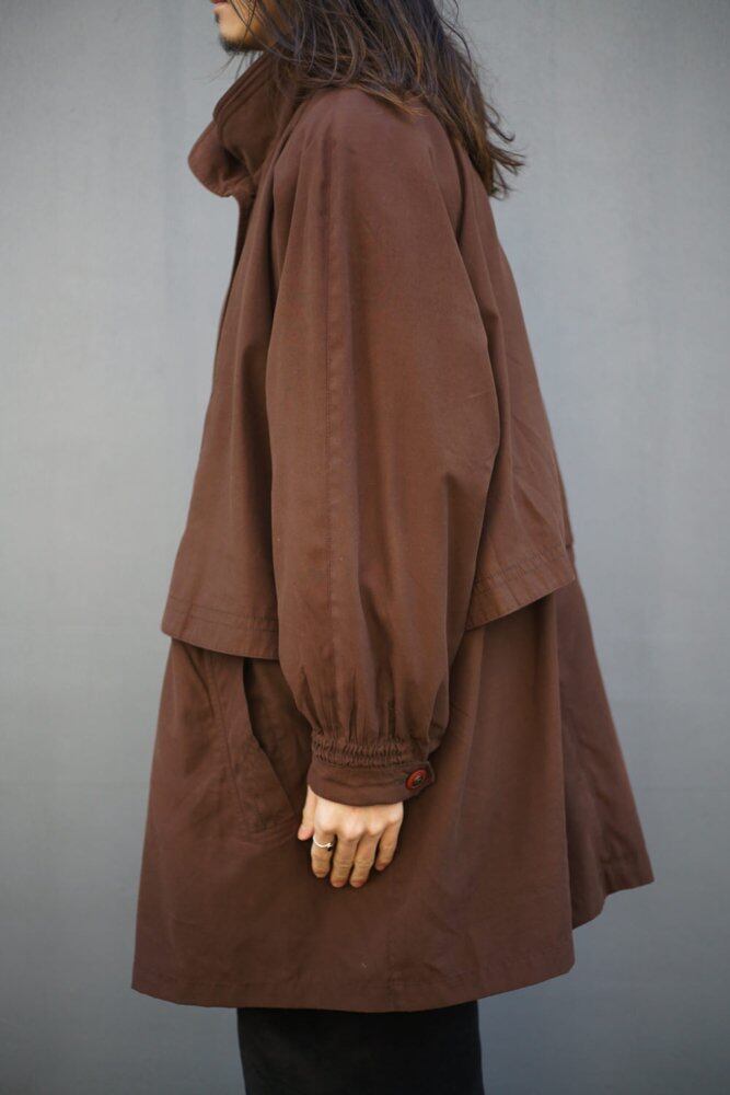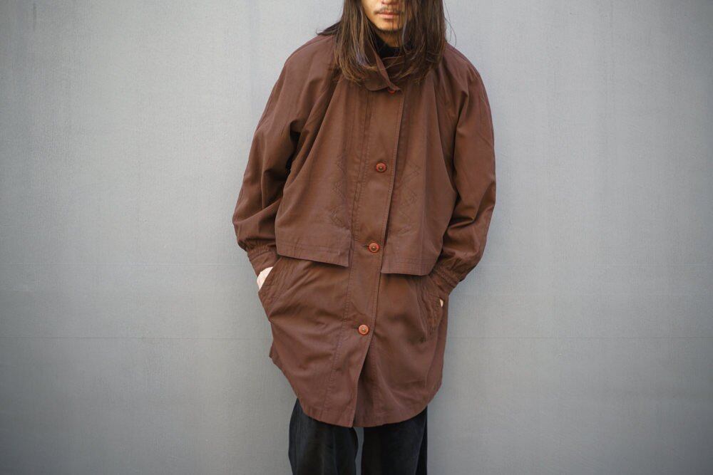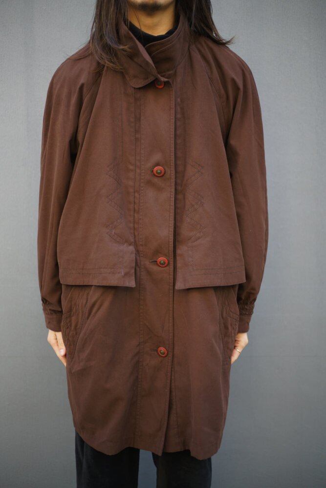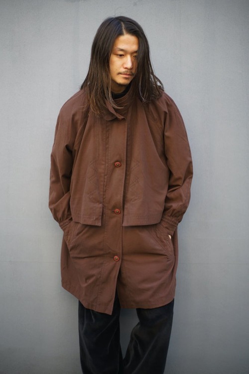 It has a double-walled faux layered stand collar, storm shield-like flaps on the front and back, and functional details like an outdoor jacket that enhance the atmosphere.