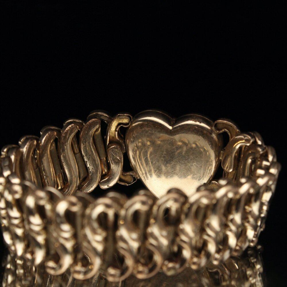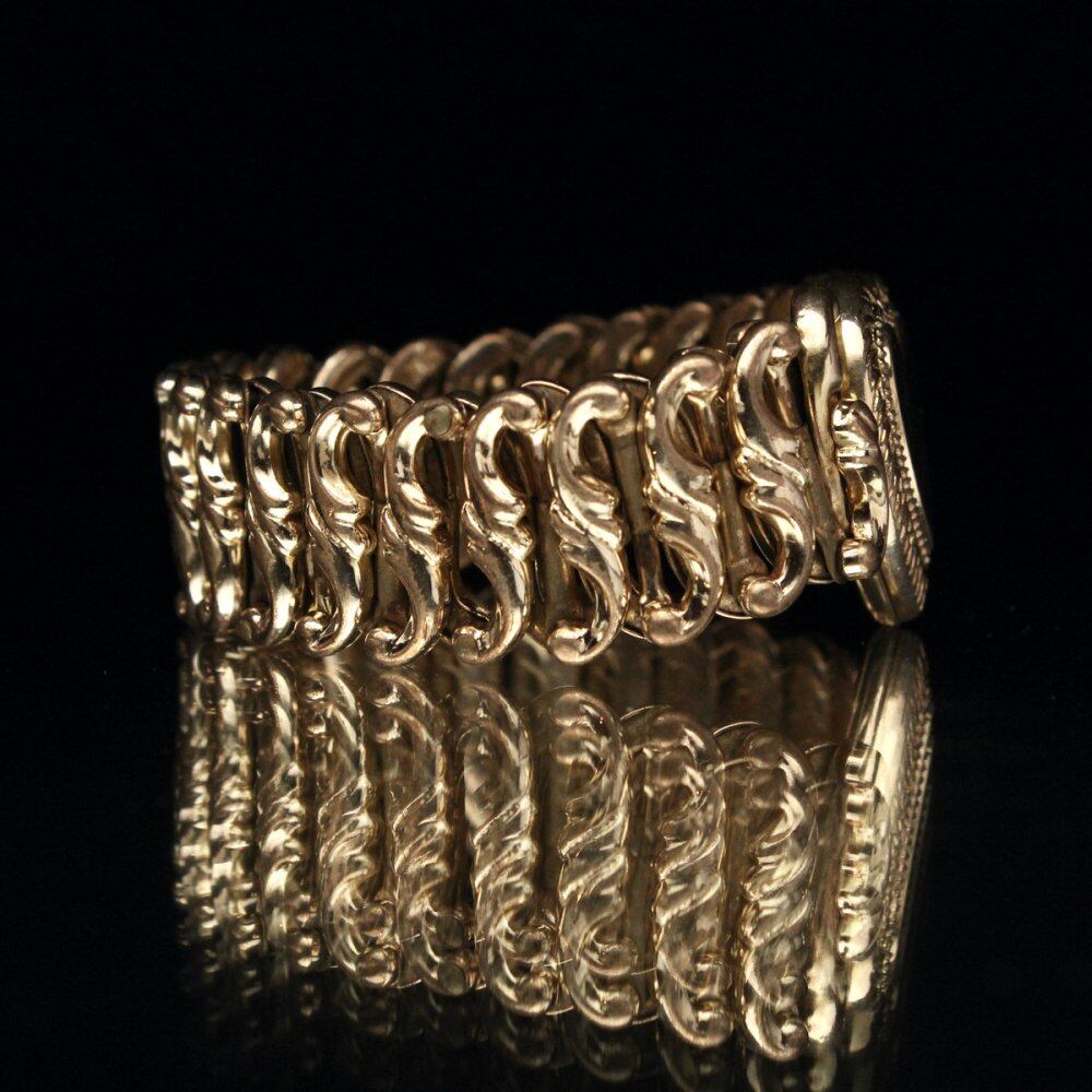 This item was given to couples during wartime from the early 1900s to World War II. The elastic bellows mechanism bracelet, which is no longer made, provides a suitable fit and is thickly plated with gold, giving it a gorgeous and delicate structure that gives it a vintage, dignified and luxurious feel. This one has a rare bellows mechanism that gives it an antique look, and a simple locket top with no initials, making it a timeless design. Since it is an old item, there are dullness and small scratches due to aging. Please check the photos and understand the vintage characteristics before purchasing.