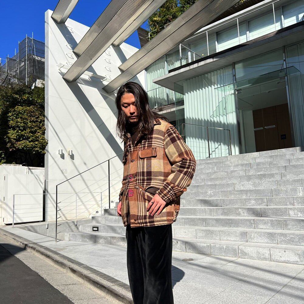 1940s Chippewa cruiser jacket The front buttonhole and repair on the left sleeve are very tasteful and have aged to the point where it can be said to be artistic.The flap pockets that do not match the pattern also make this a charming piece.It is sturdy and thick. 100% wool fabric with a nice beige and brown check pattern.A good size piece that is not too big and has just the right amount of room.