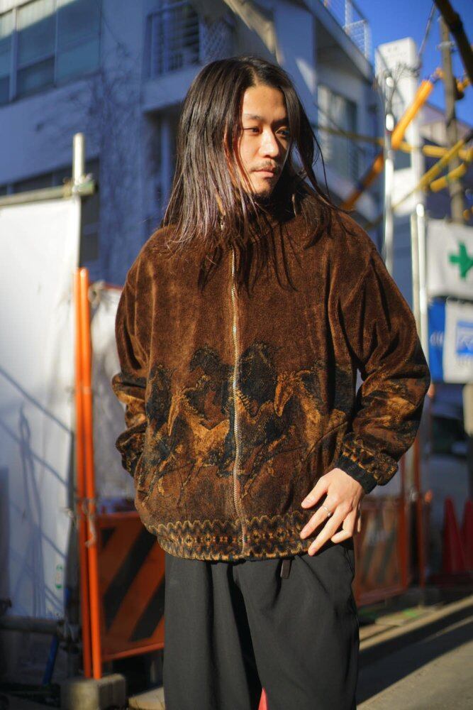 This is an all-over patterned fleece jacket made by OUTBACK in the 1990s.