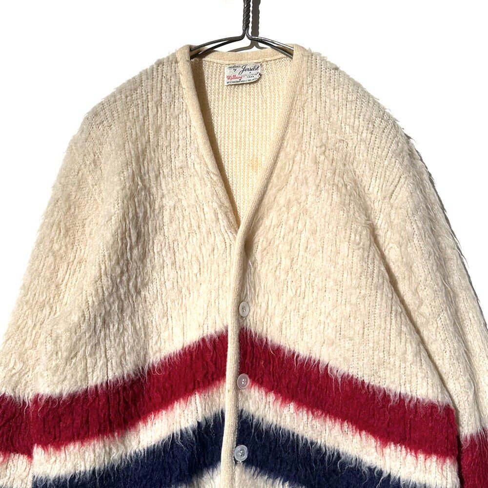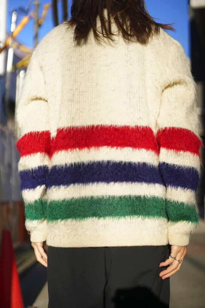 The white base color, which is rare for vintage mohair, and the tricolor color scheme give it a retro and luxurious look.