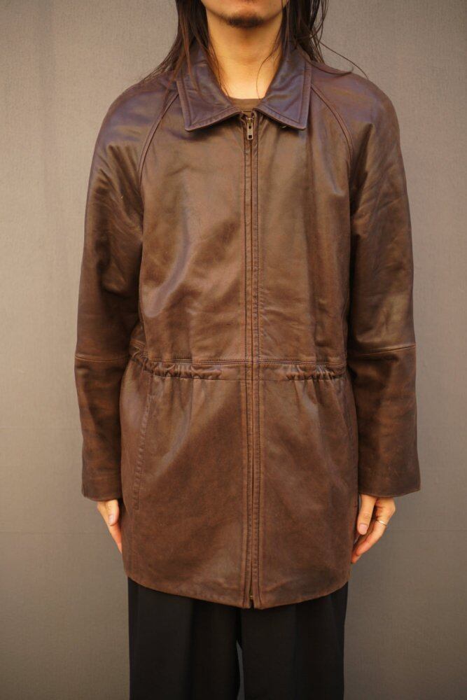 A long-length, zip-up sports jacket type made of moist, soft lamb leather with a smooth texture.