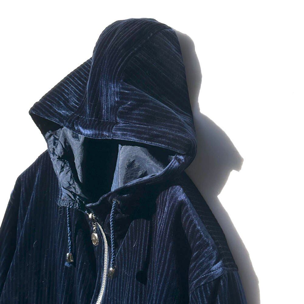Reversible velor fabric and nylon with ridges similar to elegant shiny corduroy.
