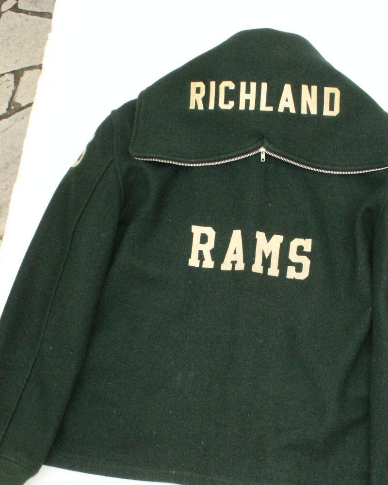 Runtag Champion award jacket from the 1970s. Made of sturdy melton fabric and combined with the dark green color, it has a more vintage-like mannish appearance. This is a very rare specification as it does not have ribs on the hem like USNAs wool jackets and has a sailor collar with a zipper. The placement and design of the flocked patch is also cool and has a unique vintage feel. The loose and big silhouette shows off an interesting silhouette that does not fit the usual size. Although it has aged, it is in good condition as a used item. Since it is an old item, there may be rare signs of deterioration over time. Please check the photos and be aware of the vintage characteristics before purchasing.