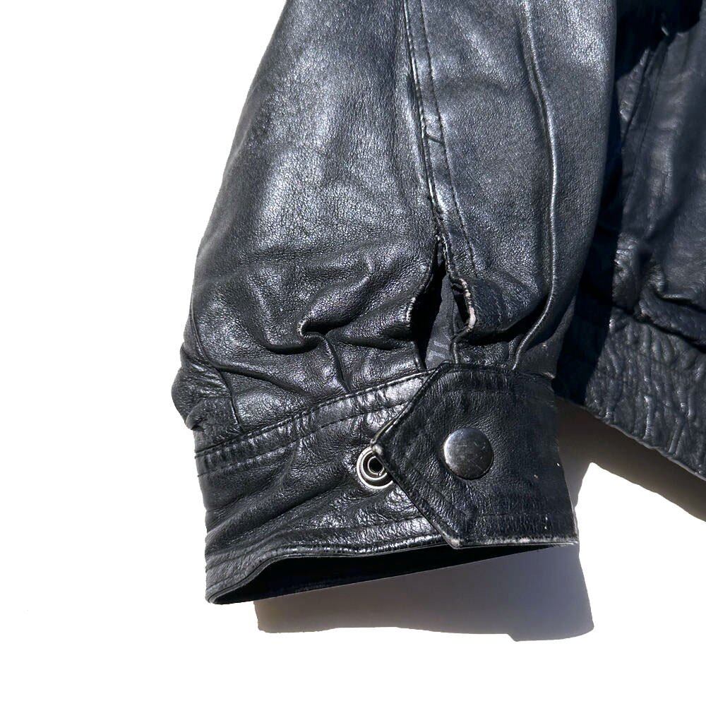 A zip-up leather jacket made by WILSONS from the 1990s.