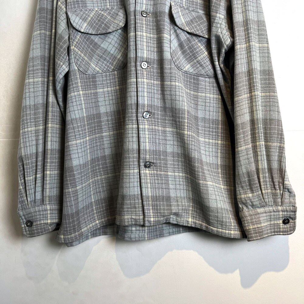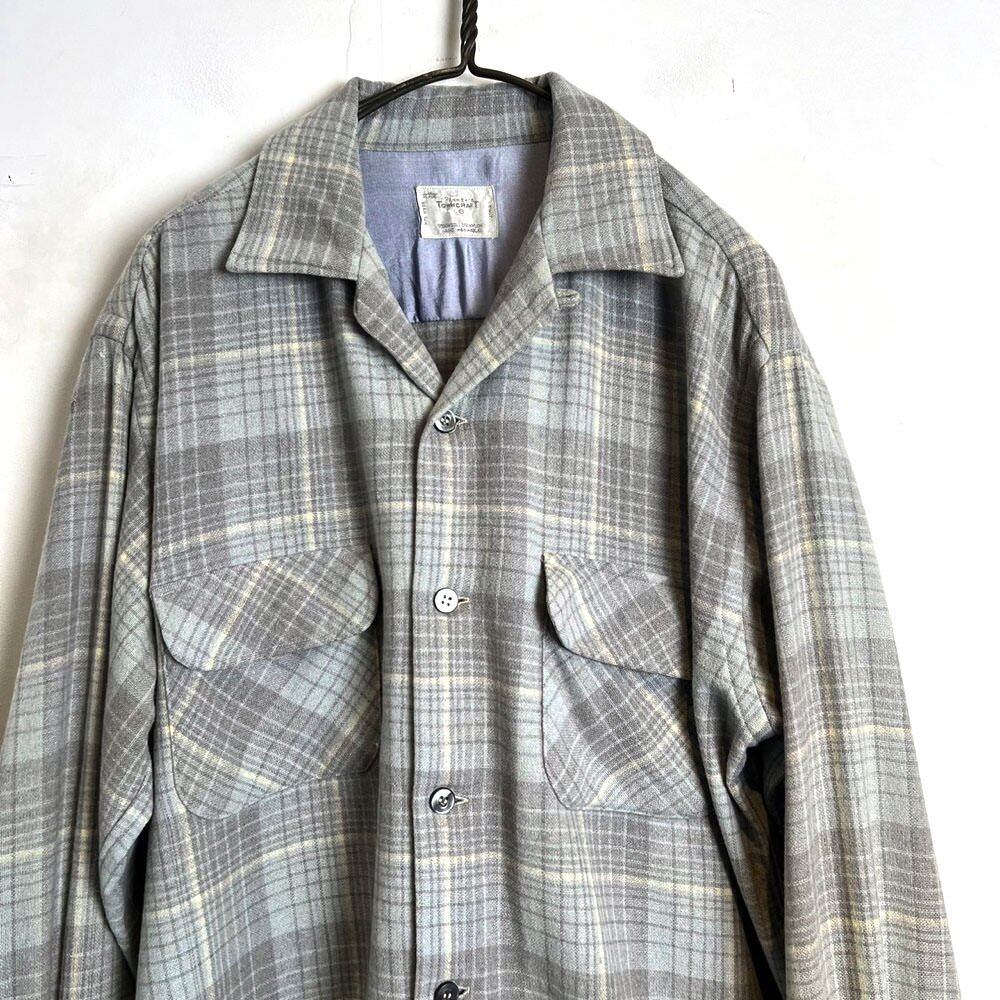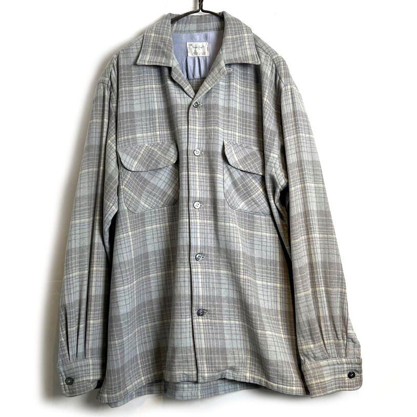 60s Town Craft Wool Shirt The pale gray and pale blue check gives it a mature and classy appearance.It is a blend of wool and nylon that is soft to the touch and doesnt feel prickly.Sizes are 16 and a half, L size. A good silhouette with just the right amount of room.