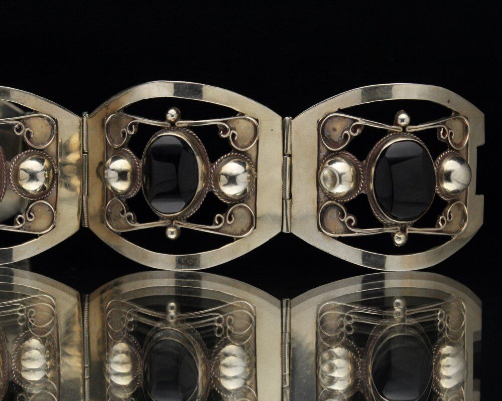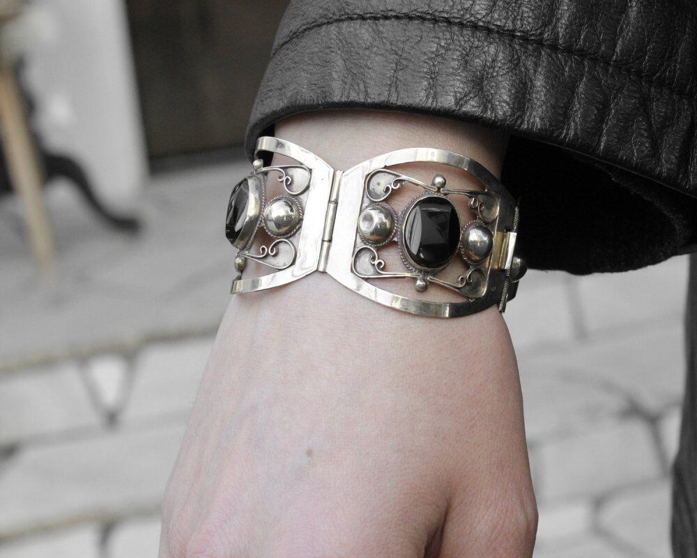 Made in Mexico, one of the worlds leading silver mining areas, where many silver artists and craftsmen have gathered since ancient times. This is a vintage item that has attracted attention in recent years, with a unique evolution that shows influences from Aztec natives to Native American jewelry-like designs that show the influence of American Southwestern, and even sophisticated minimal design from Scandinavia. This coin silver (alloy) is probably a mixture of brass and silver, and has a unique color with a slight gold tinge, and the traditional design gives it a more antique appearance. The design has an impactful design with a three-dimensional, wide silhouette that follows the wrist. Hallmark circa 1930s, stamped Made in Mexico. Since it is an old item, there may be some scratches, etc. Please check the photos and understand the vintage characteristics before purchasing.