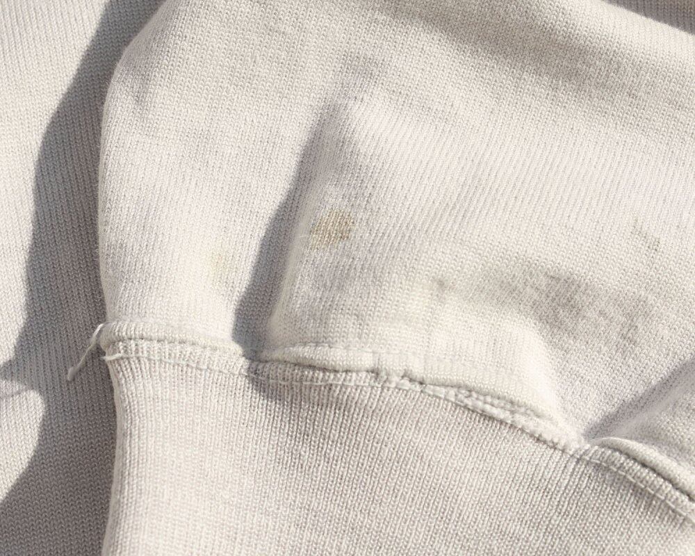 1960s Russell L/S jersey. It is probably made of high-density rib milled cotton/rayon fabric, and has a smooth and firm texture that is somewhere between sweatshirt and jersey fabric. The front features a zipper that has been seen since the 1950s, and the unusual structure with action ribs on the shoulders accentuates the design and enhances the overall elegance. The L size has a well-balanced silhouette that is roomy for this generation, and the vintage-like long ribs also help give it a good balance. There are light stains here and there, and there is a slight reddish tinge throughout. An individual in good condition considering its age. Since it is an old item, there may be rare cases of deterioration over time. Please check the photos and understand the vintage characteristics before purchasing.