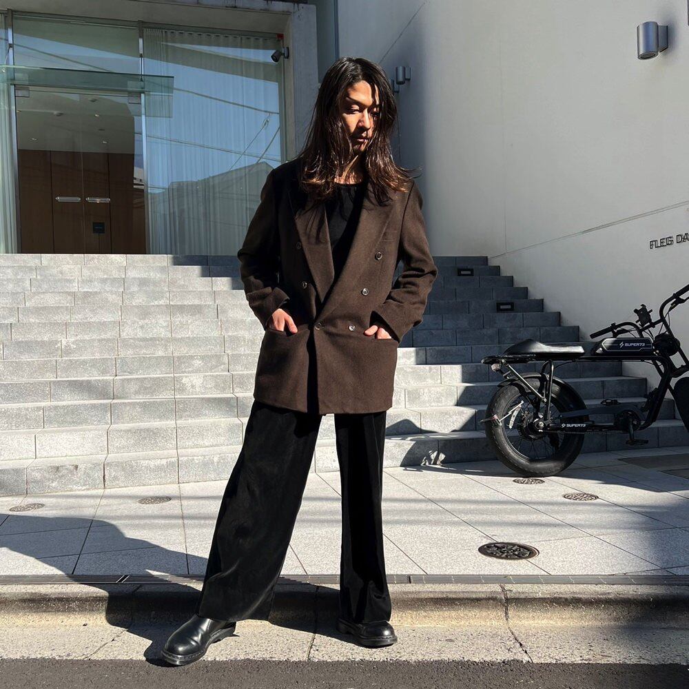 Double-breasted jacket from the 90s A vintage jacket with a fluffy, light and soft texture made from a blend of wool and about 10% cashmere.The dark khaki brown color gives it a mature look.It has a very unusual natural look for vintage double-breasted jackets. A piece with a gently falling shoulder silhouette, a moderately spacious size, and a beautiful balance of the overall silhouette.
