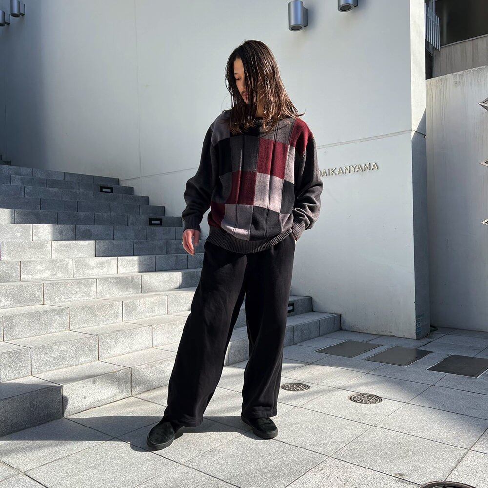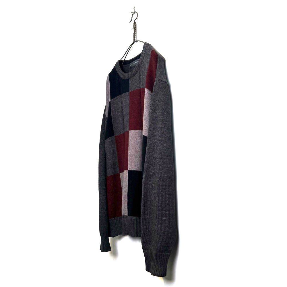A 90s crew neck sweater with a gray, black, and burgundy block pattern in mature colors. Made of cotton and acrylic material, it is a vintage knit that is smooth and smooth to the touch without any prickly feeling. It is a good size with just the right amount of room, and can be worn as a single piece. This item is easy to match as an inner layer.