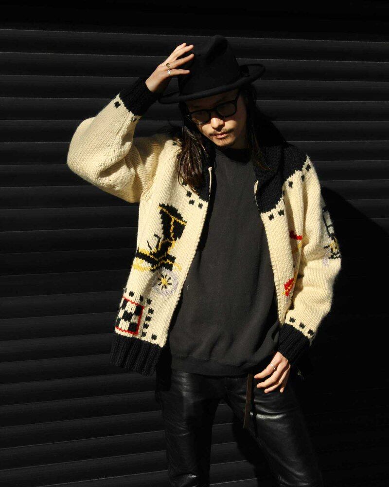 Cowichan knit from the 1960s. Cowichan knitting is a traditional knitting technique from Vancouver Island, Canada, combining European textiles and indigenous traditions to create distinctive items. It peaked around the 1950s and became popular with many manufacturers outside Canada producing it with pop patterns. This is a classic classic car pattern that has a pop and cultural feel and is eye-catching, but it is a rare piece that uses a lot of black color throughout. It has a pop of contrast and a cool look, and the sturdy wool yarn is soft and knitted for a natural look. A rare piece with a well-balanced silhouette and in good condition. Since it is an old item, there may be rare cases of deterioration over time. Please check the photos and understand the vintage characteristics before purchasing.