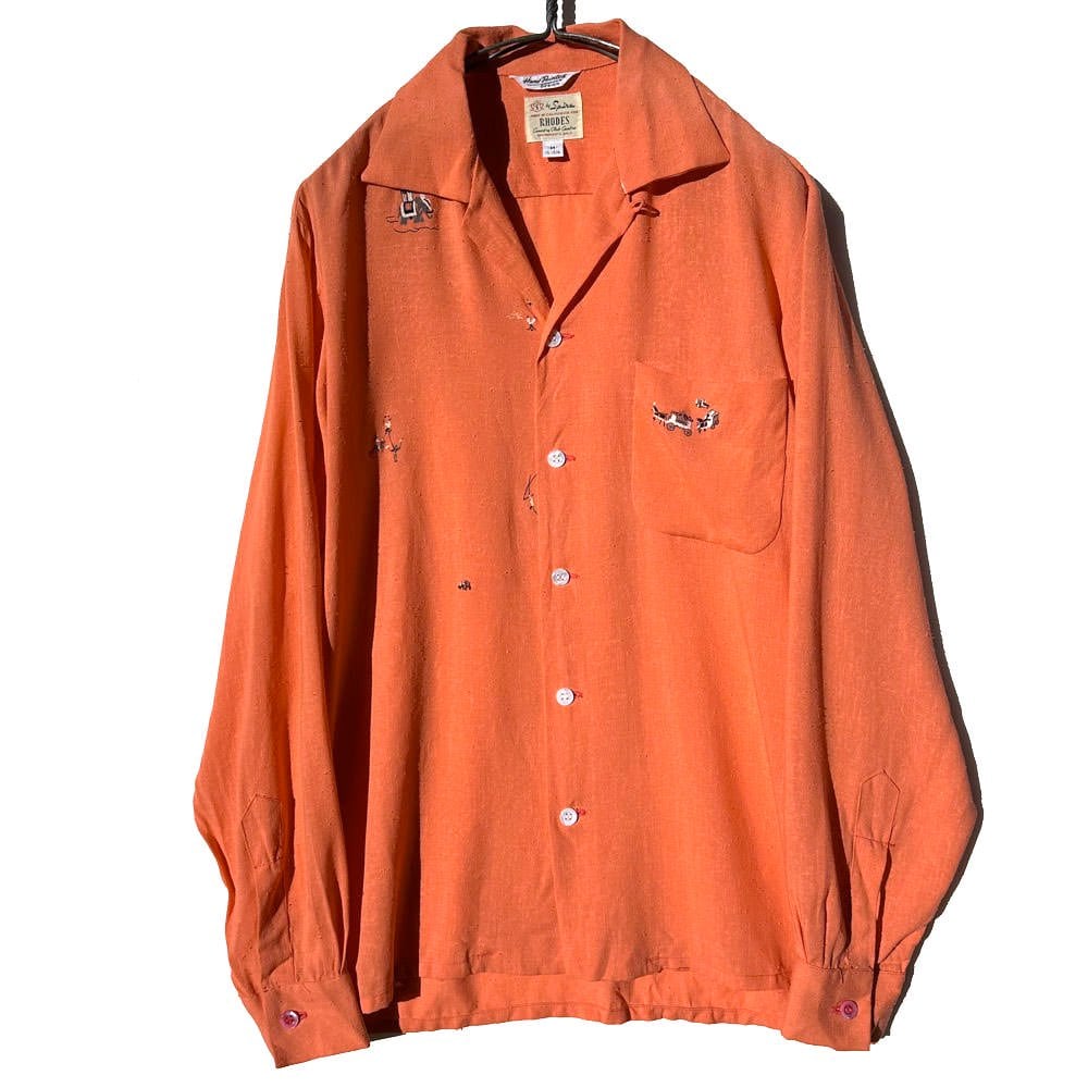This is an open collar rayon shirt made by RHODES from the 1950s.