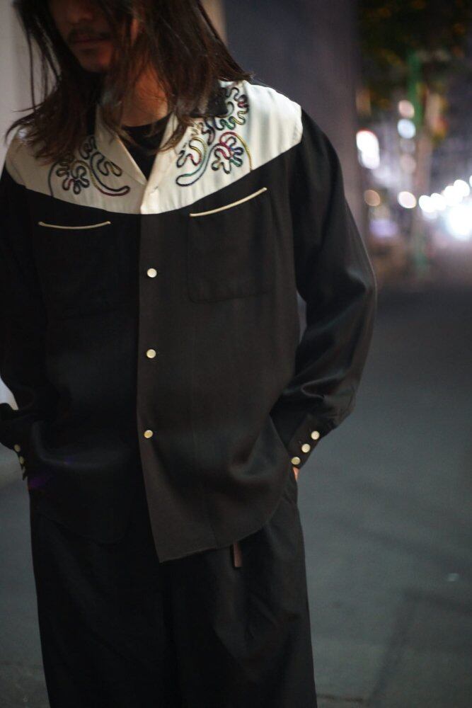 A masterpiece made of light-textured rayon fabric, with a rare black base and white yoke, making the colorful yet simple embroidery stand out.
