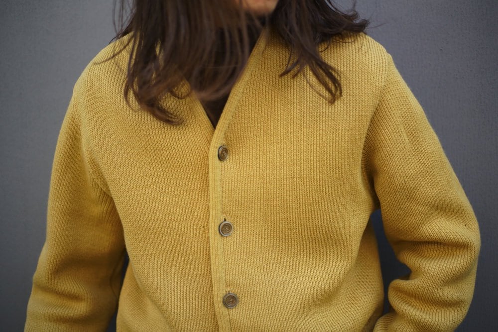 It has a classic design with a narrow V zone typical of the 1960s, and is knitted with medium-weight thick wool yarn, giving it a lettered cardigan-like feel and a soft, smooth texture that has aged over time.