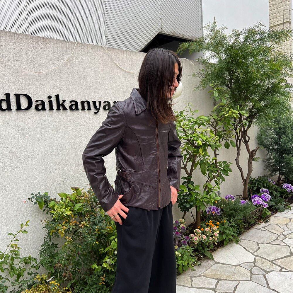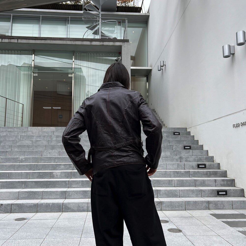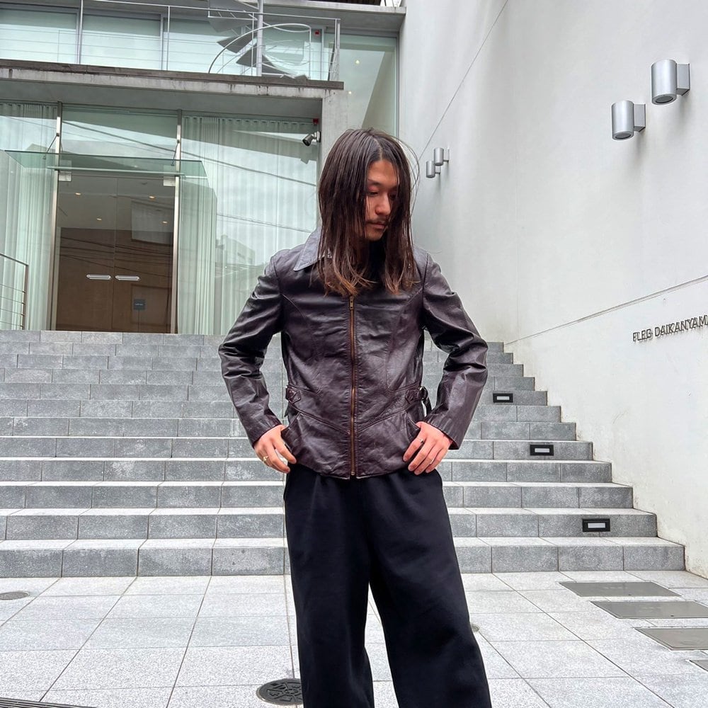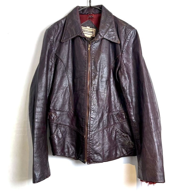 A leather jacket from the 70s. A beautiful slender silhouette with a shape typical of this era. The brown color has a slight reddish tinge to it. There is some damage to the lining of the sleeves, but there is no problem with wearing it.