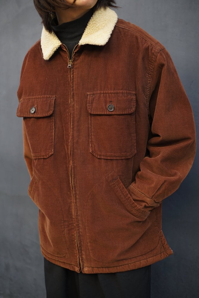 The white boa stands out against the reddish brown corduroy fabric, giving it a distinctive vintage feel.