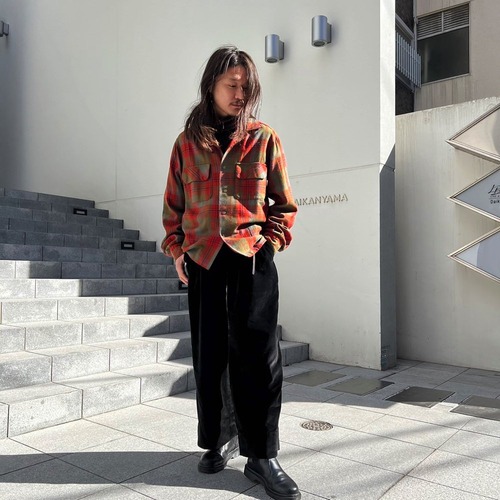 A 60s wool shirt with a check pattern in vintage shades of orange, olive, and gray. Made of acrylic blend wool fabric, it is soft to the touch and does not feel prickly. It is a good size and has a nice silhouette with just the right amount of room.