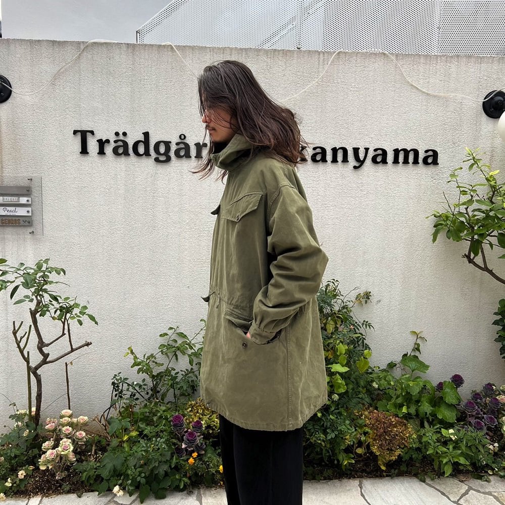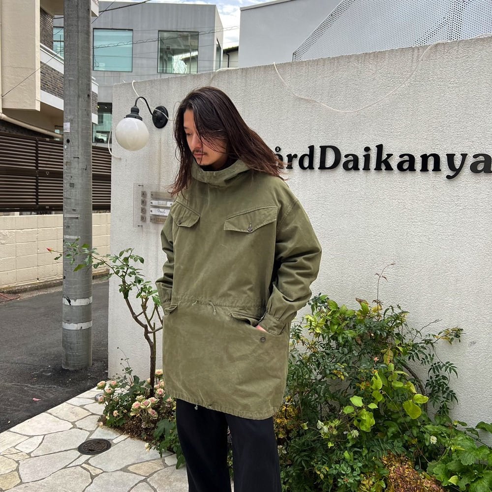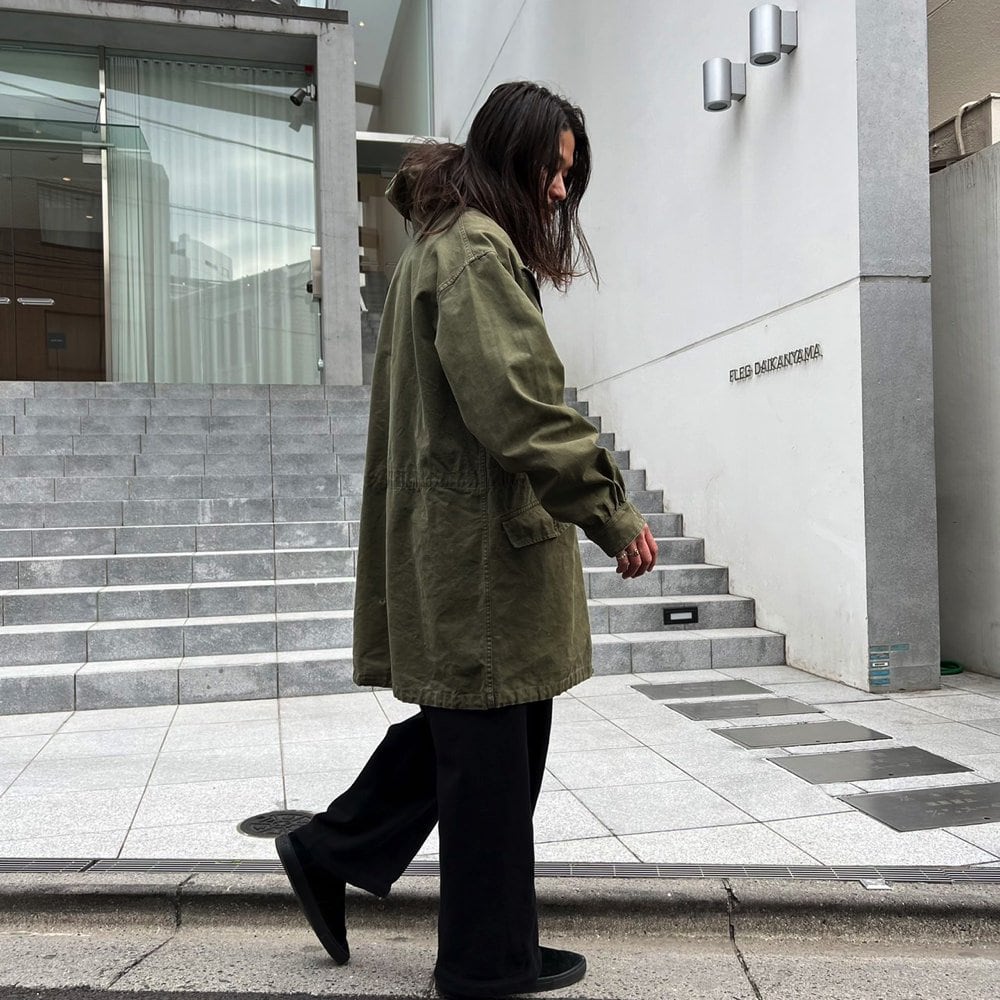 A 50s French Army mountain smock that can be worn loosely, with a faded olive color and a voluminous feel.The hood, waist, and hem each have a drawcord, so you can wear it to change the silhouette. This is a very interesting piece that can be worn on the street or as an outdoor item.