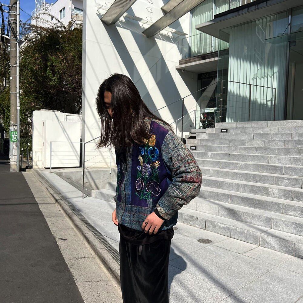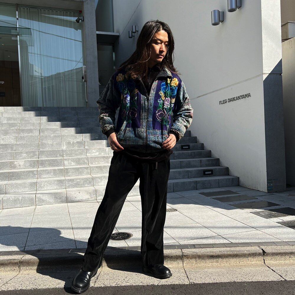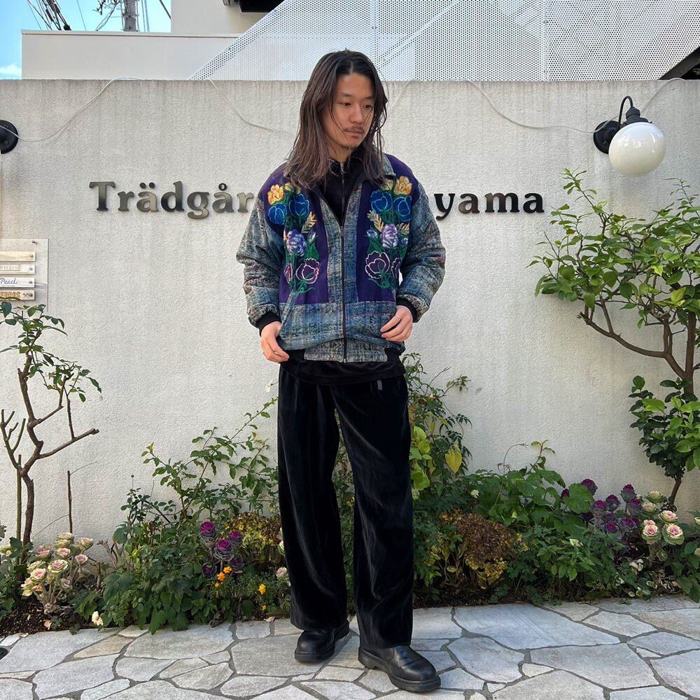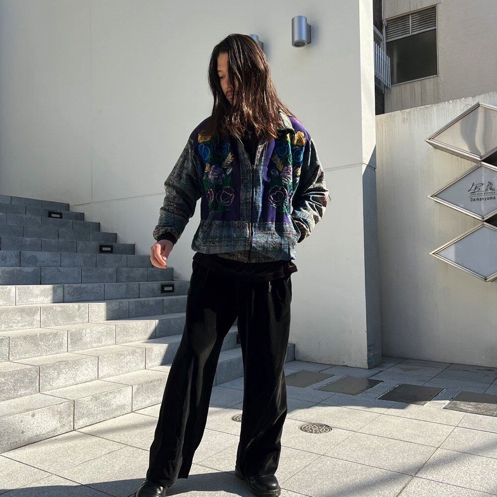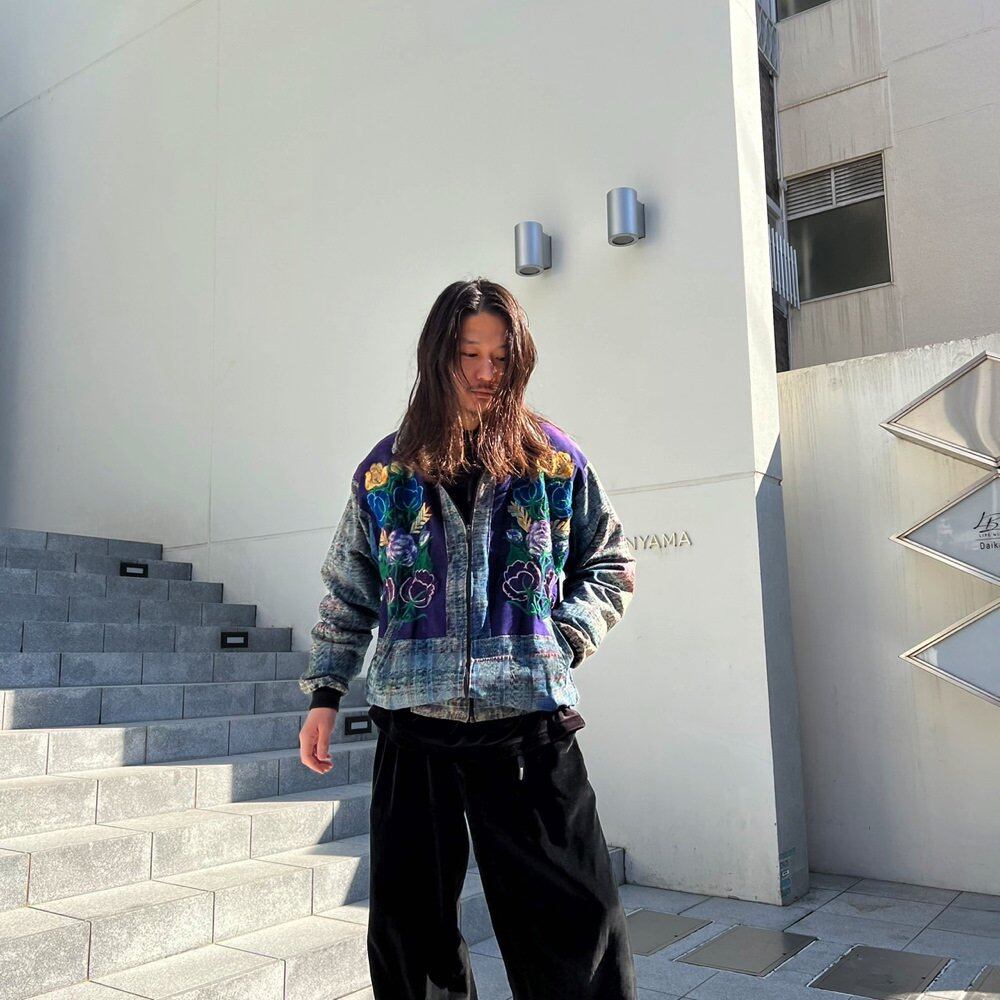 A zip-up jacket from the 80s.The fabric has an ethnic feel and is dyed with indigo in a unique color.The purple flower embroidery on the body gives it a great atmosphere.Its a good size with just the right amount of room. The silhouette is perfect for wearing in early spring.
