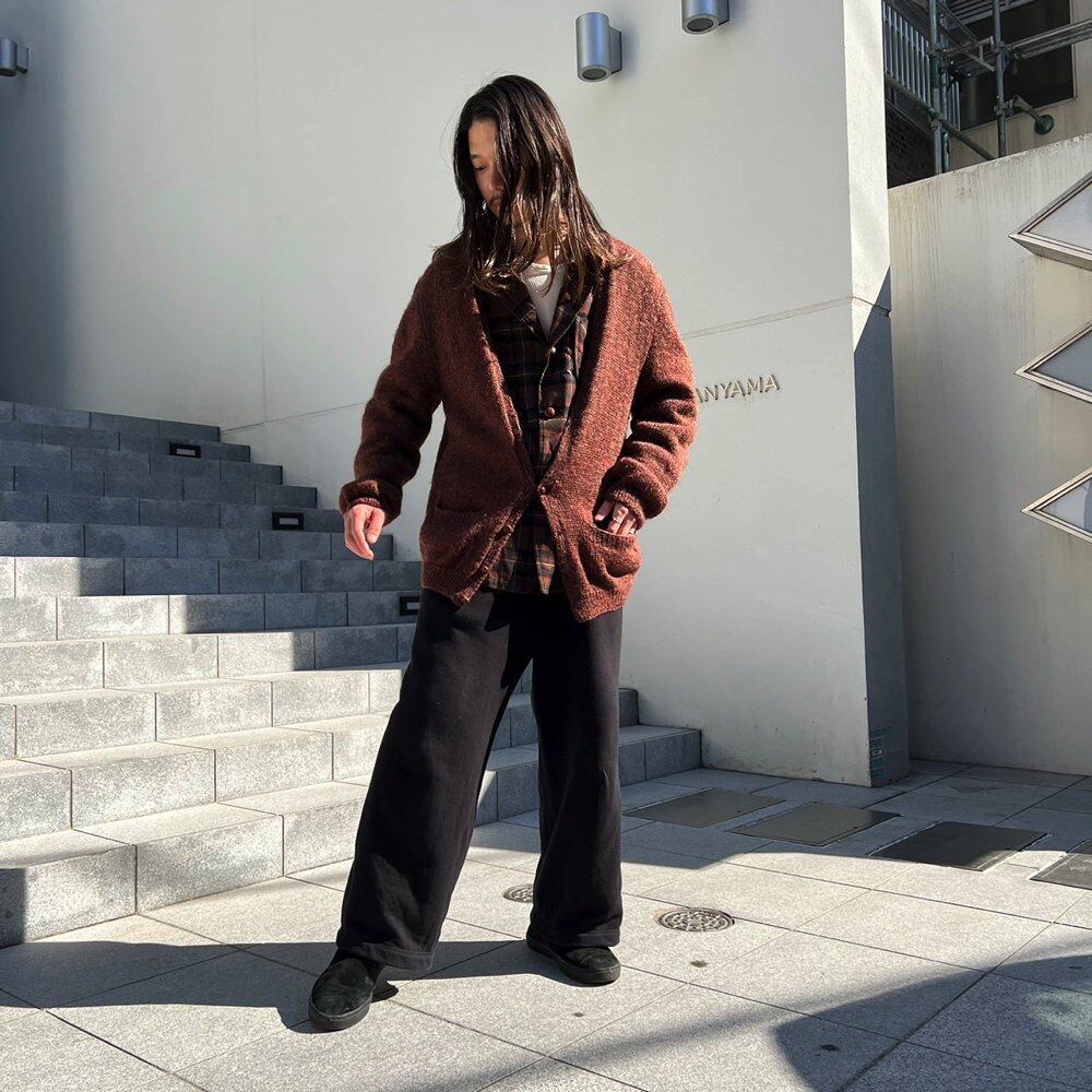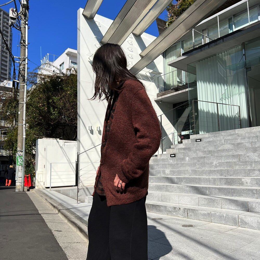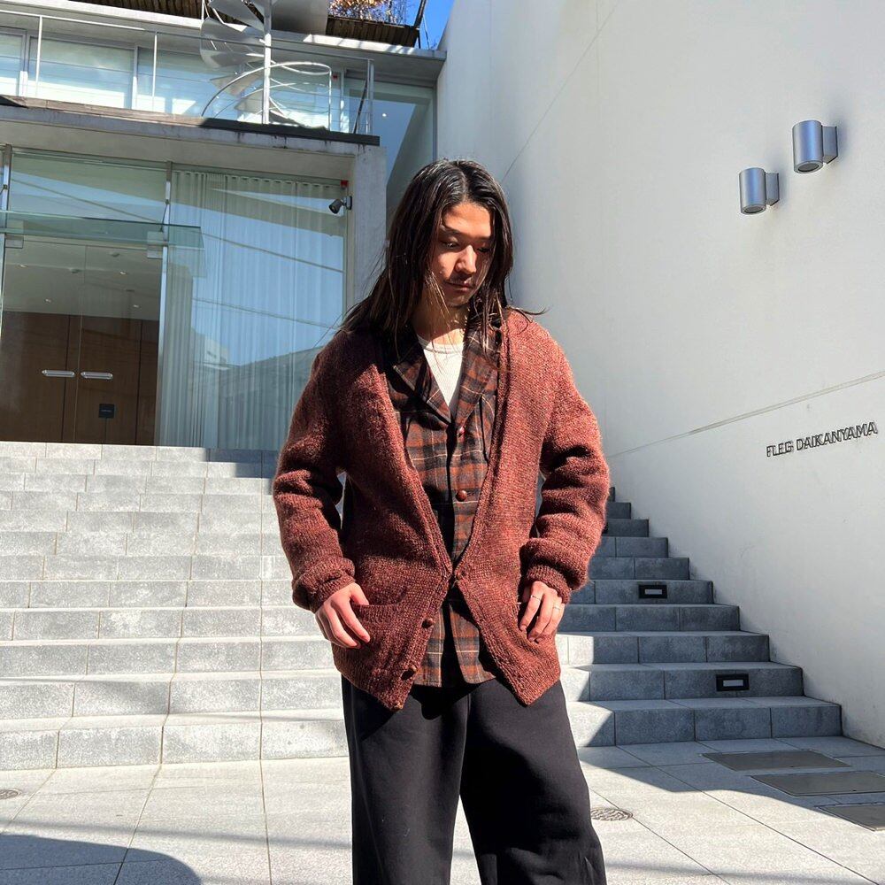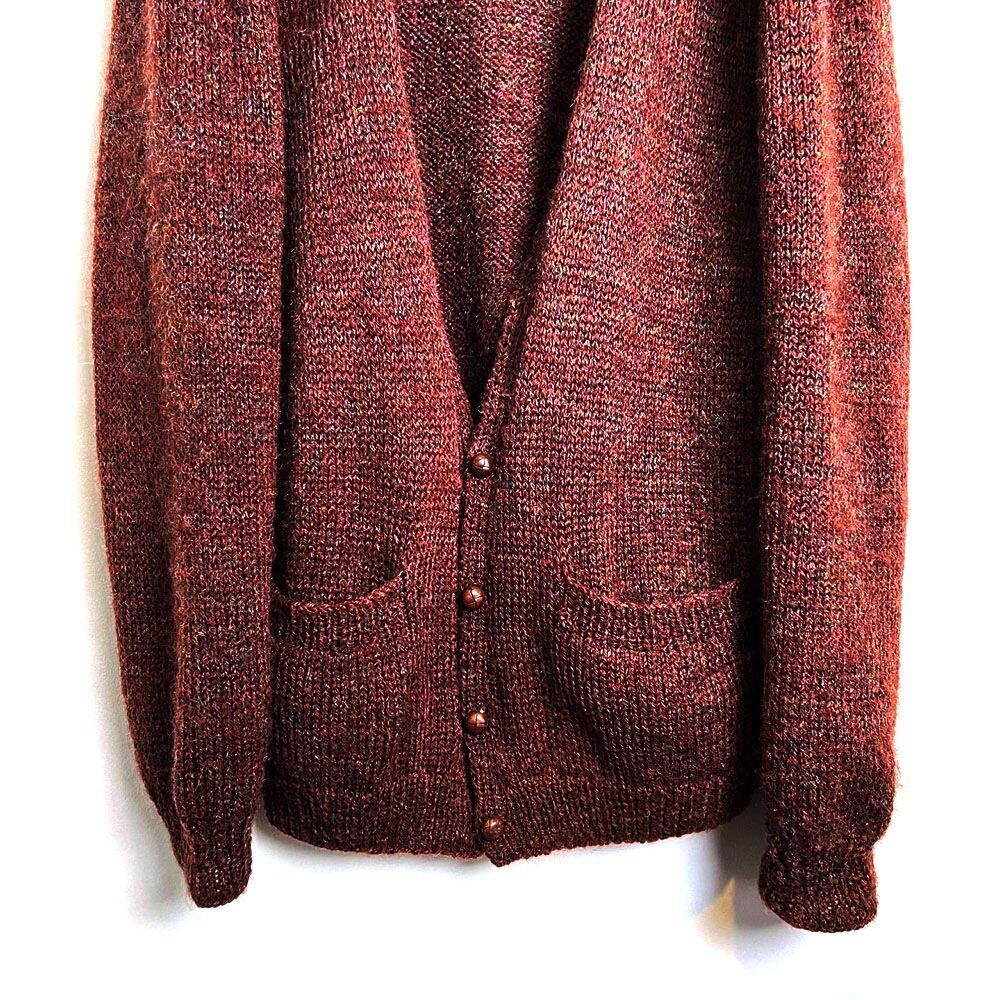 Hand-knitted vintage cardigan from the 1960s. A mix of brown, green, orange, and yellow in a nice deep color that gives you a sense of depth. It has a relaxed silhouette with a loose fit that is rare for cardigans of this era, and has hand pockets for ease of use. Its a good first place