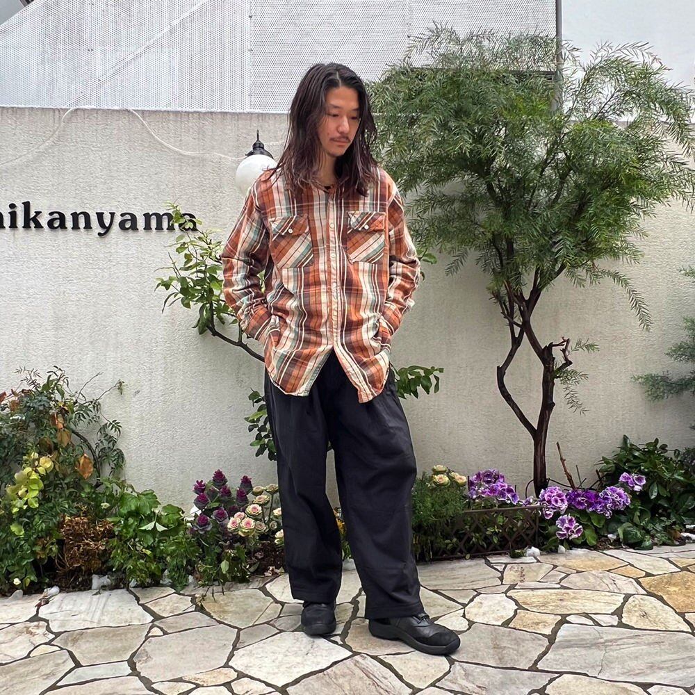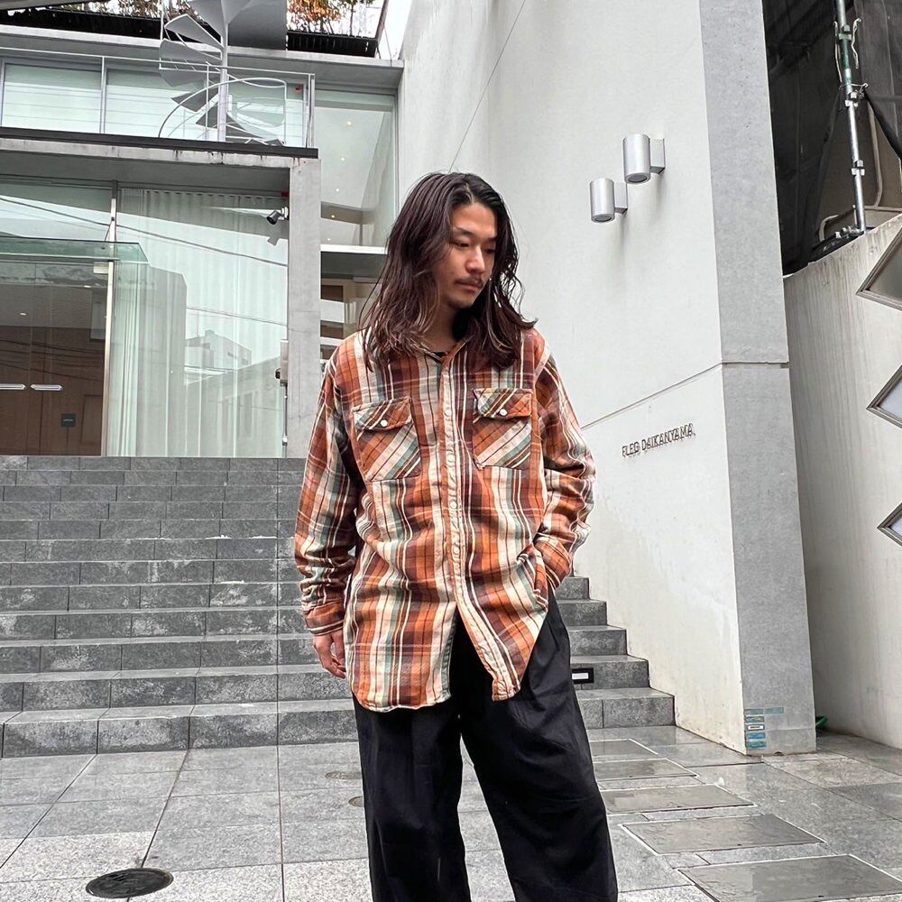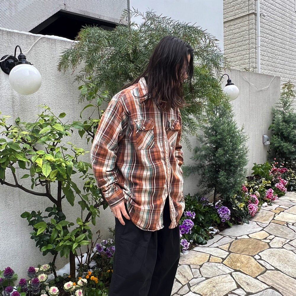 Cotton flannel shirt from the 70s This is a sturdy heavy cotton flannel that has changed over time to a nice texture.A check pattern with a nice earthy brown x off-white color and saxophone blue as a nice accent. A piece with a relaxed and oversized silhouette that gives off a nice atmosphere.