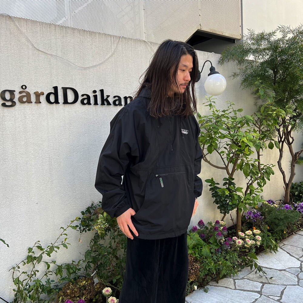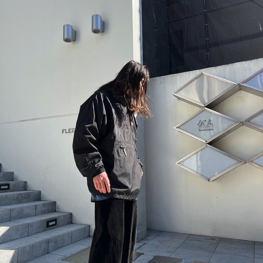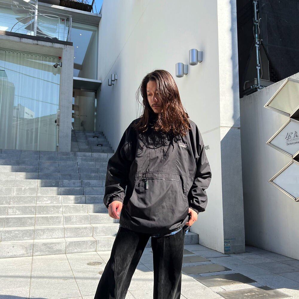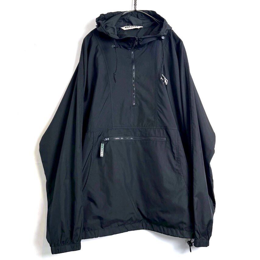 90s anorak hoodie 100% polyester fabric with a light and smooth texture.Its not too big and has a good balance of size, so its easy to wear alone or as a layered style.The black color makes it easy to match and mix and match.
