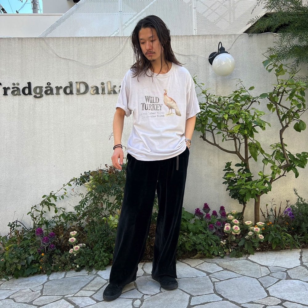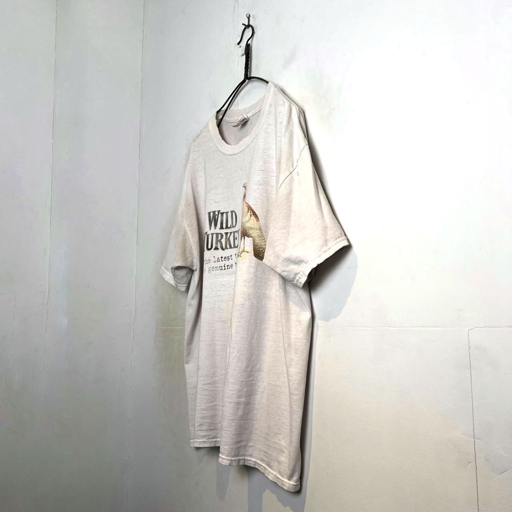 Bourbon Whiskey Wild Turkeys 80s promo T-shirt The print that has faded over time, the texture of the thin fabric, and the dusty white color give it a nice texture.The design has a bitter taste even among corporate vintage T-shirts. The body is an 100% cotton body from anvil, and it is a XL size that is moderately loose and has a good size.