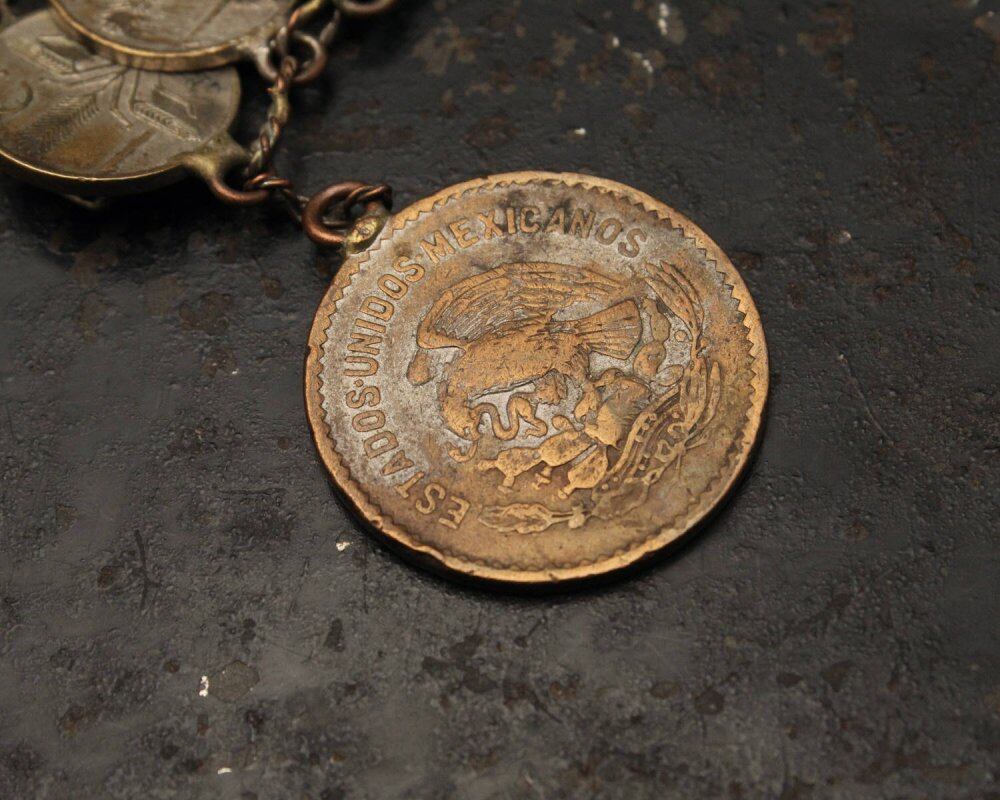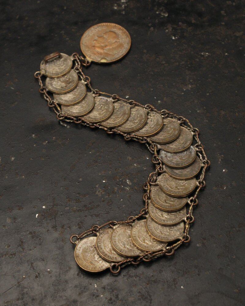 A link bracelet made with Mexican coins from the 1950s. The stacked coins give this item a different look and accent than a regular chain bracelet. It is a solid piece with many coins used, and the aged coin has a vintage feel and atmosphere. Since it is an old item, there may be some scratches, etc. Please check the photos and understand the vintage characteristics before purchasing.