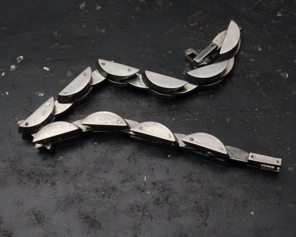 Made in Mexico - Taxco, one of the worlds leading silver mining areas, where many silver artists and craftsmen have gathered since ancient times. This is a vintage item that has attracted attention in recent years, with a unique evolution that shows influences from Aztec natives to Native American jewelry-like designs that show the influence of American Southwestern, and even sophisticated minimal design from Scandinavia. The half-moon design and solid, minimalist silhouette give it a mannish and elegant look. It is made of chromed sterling silver that was used around the 1950s, and has a matte and elegant construction that gives it an engineering impression. Vintage silver jewelry is so popular all over the world that heavy chain bracelets are in short supply no matter what vintage they are. Mexico-Tasco 925 silver stamp. Since it is an old item, there may be some scratches, etc. Please check the photos and understand the vintage characteristics before purchasing.