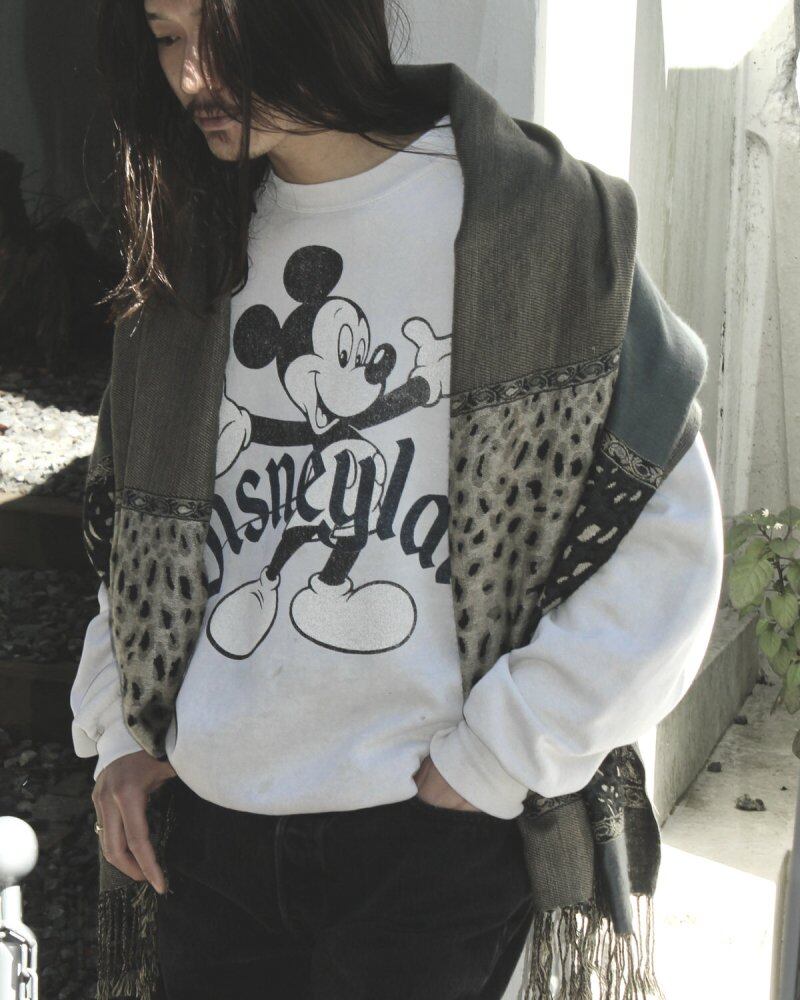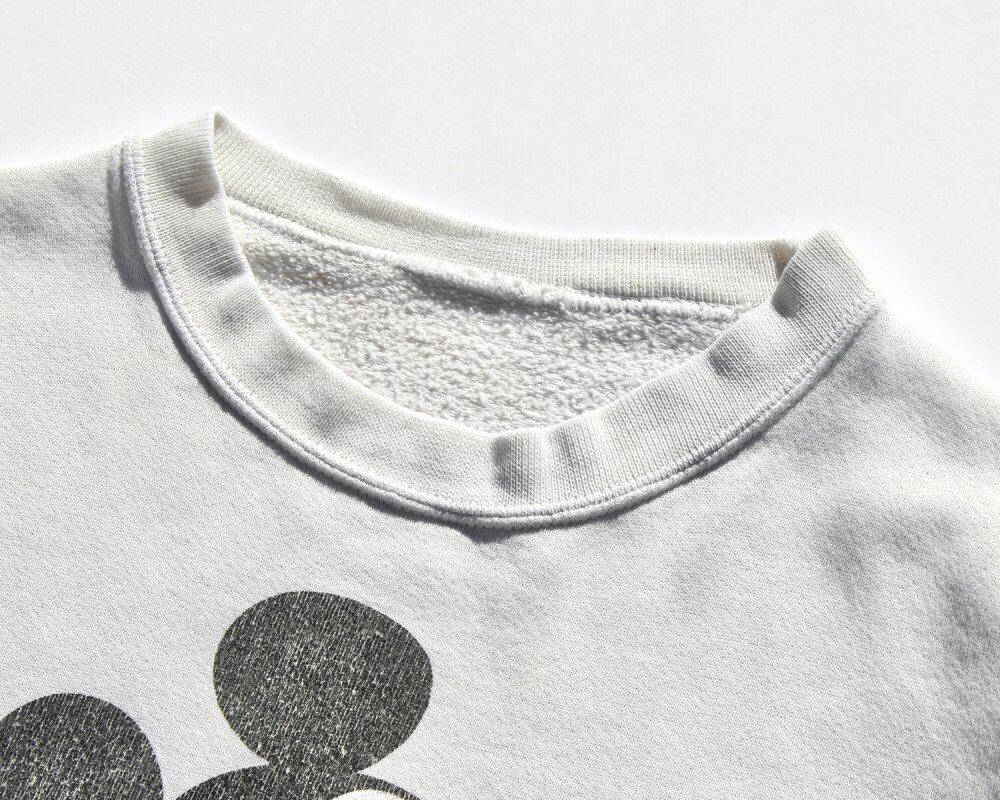 Disney original Mickey sweatshirt from the 1980s. The entire fabric has aged and has a soft, faded texture, and it has probably been bleached to give it a greyish white color, which combined with the classic print, gives it a more atmospheric feel. It has a big silhouette that is rare in this generation, and the size makes it look well-balanced. Since it is an old item, there may be rare cases of deterioration over time. Please check the photos and understand the vintage characteristics before purchasing.