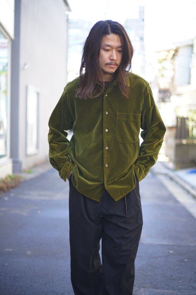 The color changes depending on how the light hits it, and the moderately thick and soft cotton velvet fabric has a soft, falling feel and a beautiful drape that falls smoothly and is stress-free to wear.