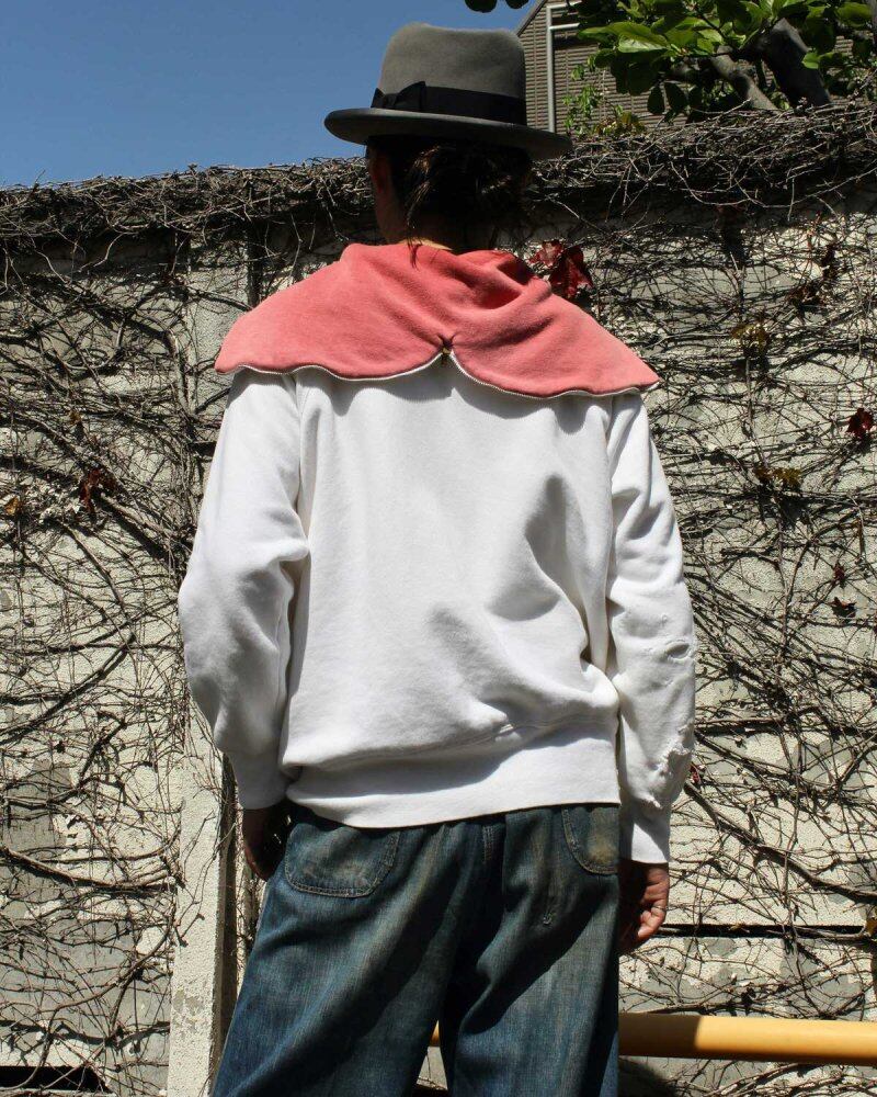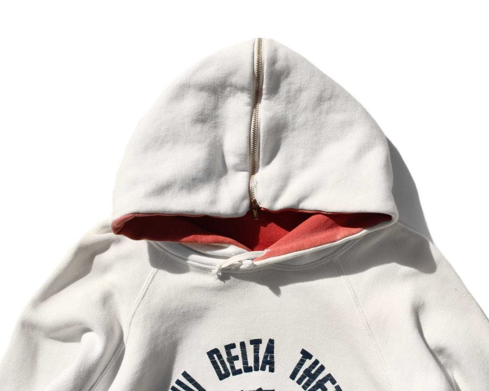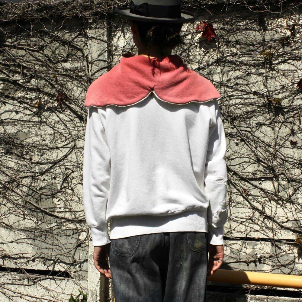 A sweatshirt parka from the 1950s. There is no tag, but it has an opening and closing hood, and the body is made of health knit, with a rare color scheme of white with red accents. The faded texture of the hood, the peeling flocked fraternity print, and the repaired sleeves give it a more vintage feel. This is a rare size that is roomier than L size, even among sweatshirts from this era, which tend to be small. The long ribs, which are a characteristic of this era, also add to the good balance. Since it is an old item, there may be rare deterioration over time. Please check the photos and understand the characteristics of vintage items before purchasing.