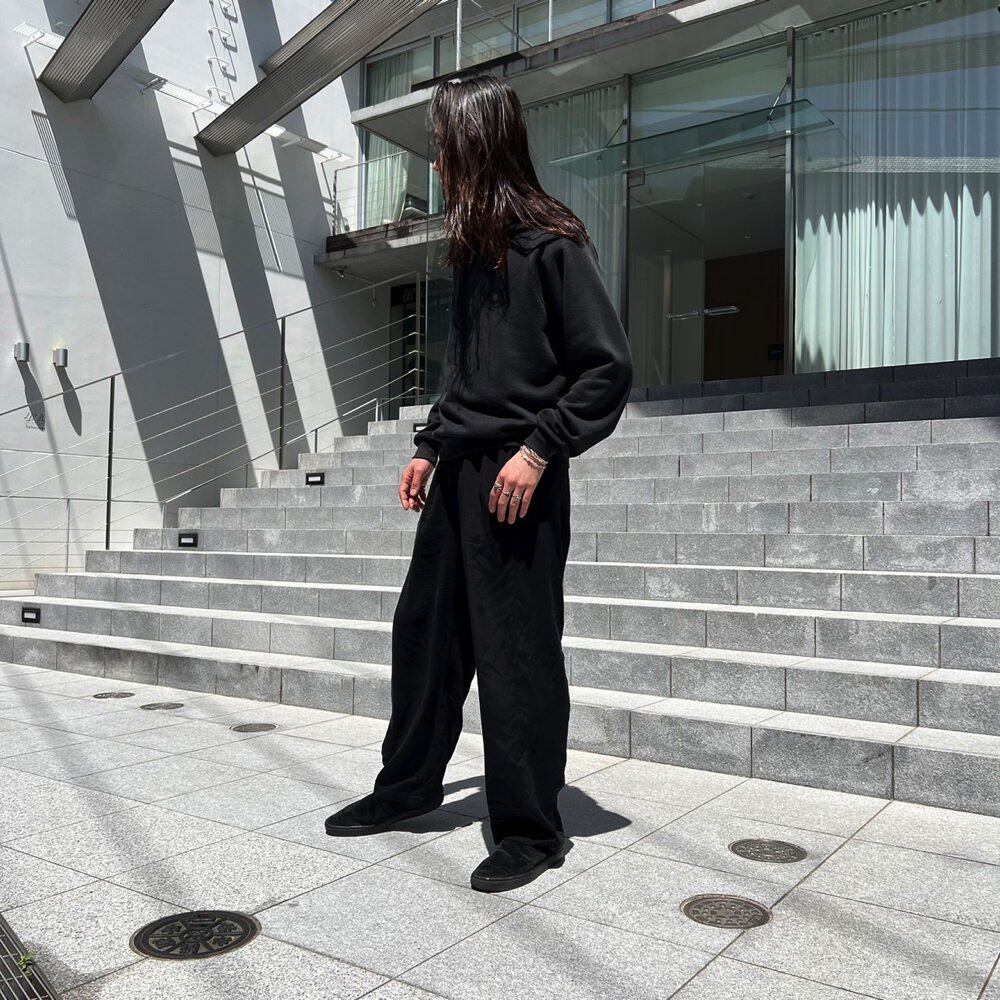 A 90s Jersey sweatshirt. It has a nice faded black color, a soft sweatshirt fabric with a moderately thin and stretchy feel, and can be worn like a long T-shirt. The size is L, and the fit is just right.