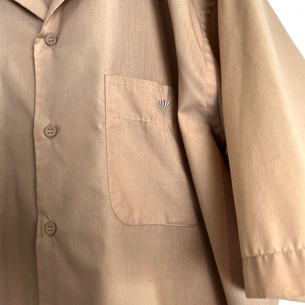 A short-sleeved shirt from the 80s. The hand stitching on the chest pocket and the embroidery on one point are intricate designs reminiscent of the 60s. The grayish beige color gives it a calm and mature feel. The polyester x cotton fabric is light and smooth to the touch.