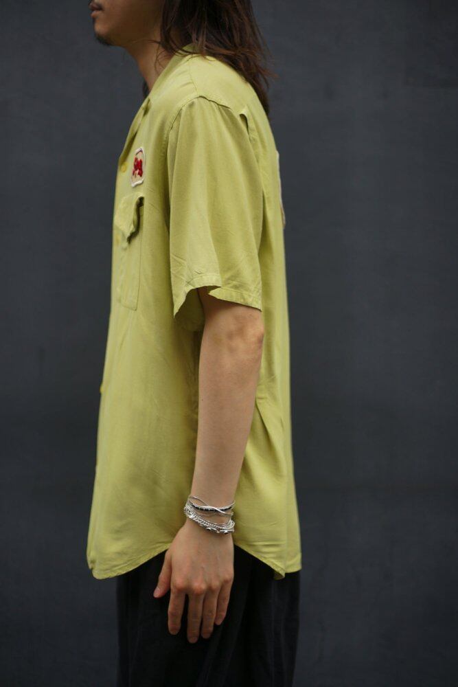 It is made from smooth rayon fabric, features a patch on the left chest and a combination of patches and chain stitching on the back, giving it a sophisticated, work-like look.