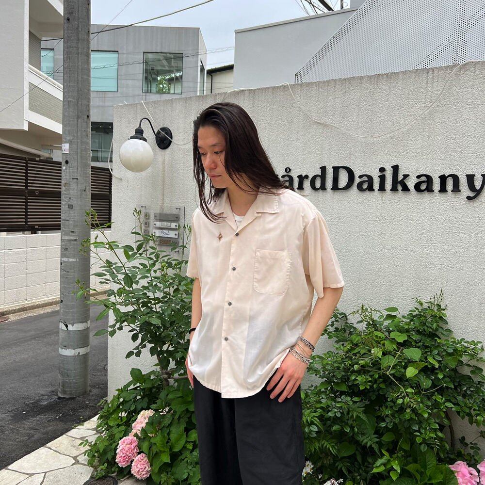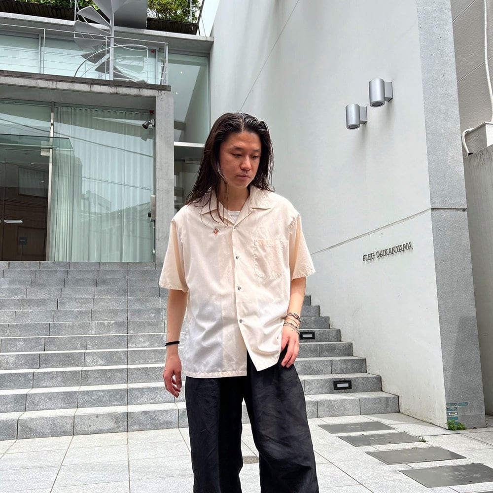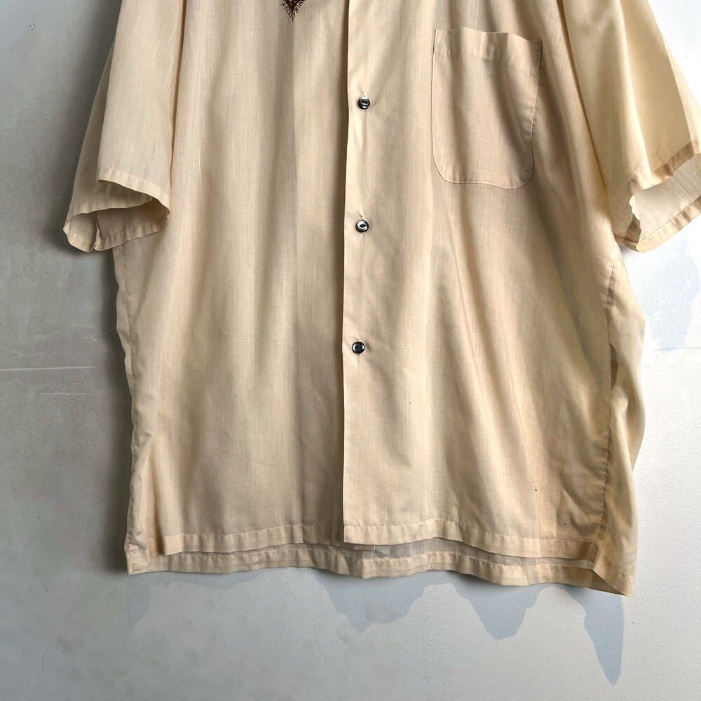 A short-sleeved shirt from the 60s. A soft pale beige color, with a simple design with a single embroidered point on the chest, giving it a mature feel. Made of cotton and polyester, the fabric is light and smooth to the touch. The size is L, and it is a comfortable piece with a moderately loose fit.