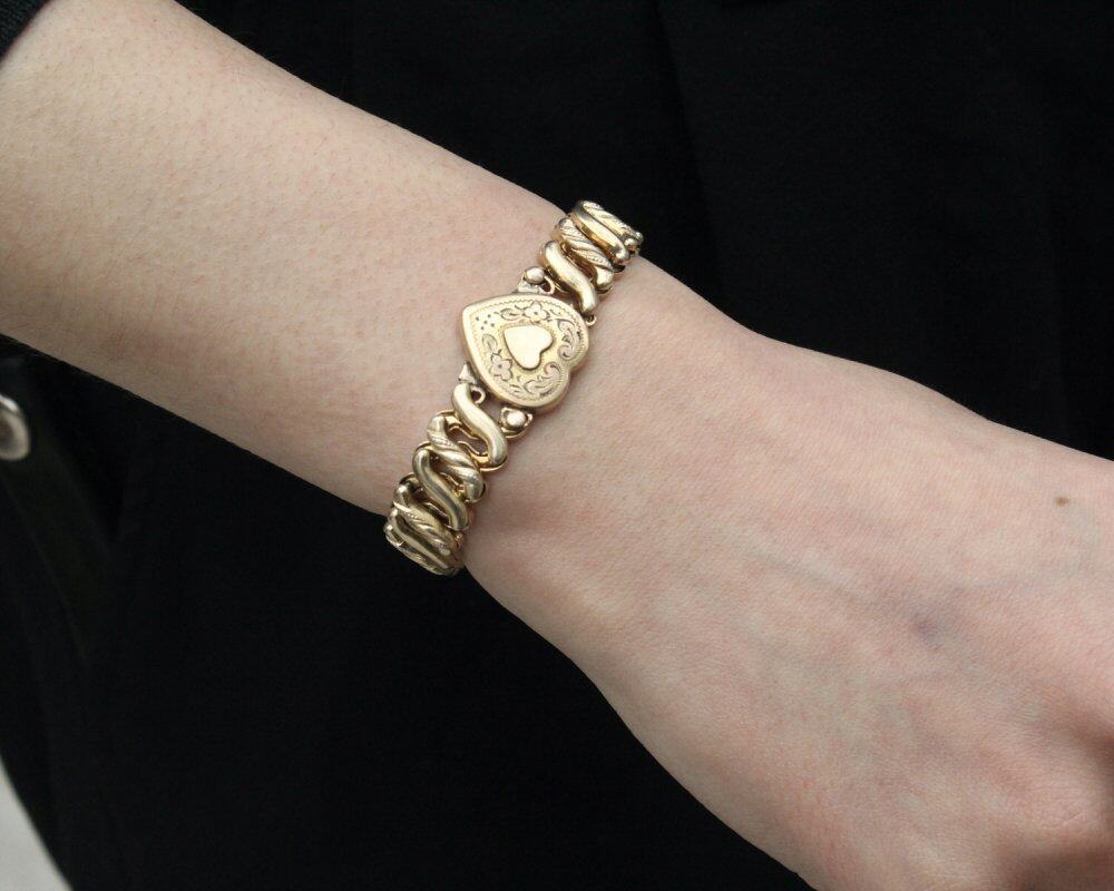 This item was given as a gift by couples during wartime from the early 1900s to World War II. Made by DF Briggs Company, founded around 1892, the bracelet has an elastic bellows mechanism that is no longer made and is named Carmen. It fits well and is thickly gold-plated. Its gorgeous and delicate construction gives it a heavy and luxurious feel that is typical of vintage items. This item has a narrow silhouette and a small top that is casually elegant. The lovely design with flowers and hearts is typical of this item. Since it is an old item, there may be some fading and small scratches due to age. Please check the photos and understand the characteristics of vintage items before purchasing.