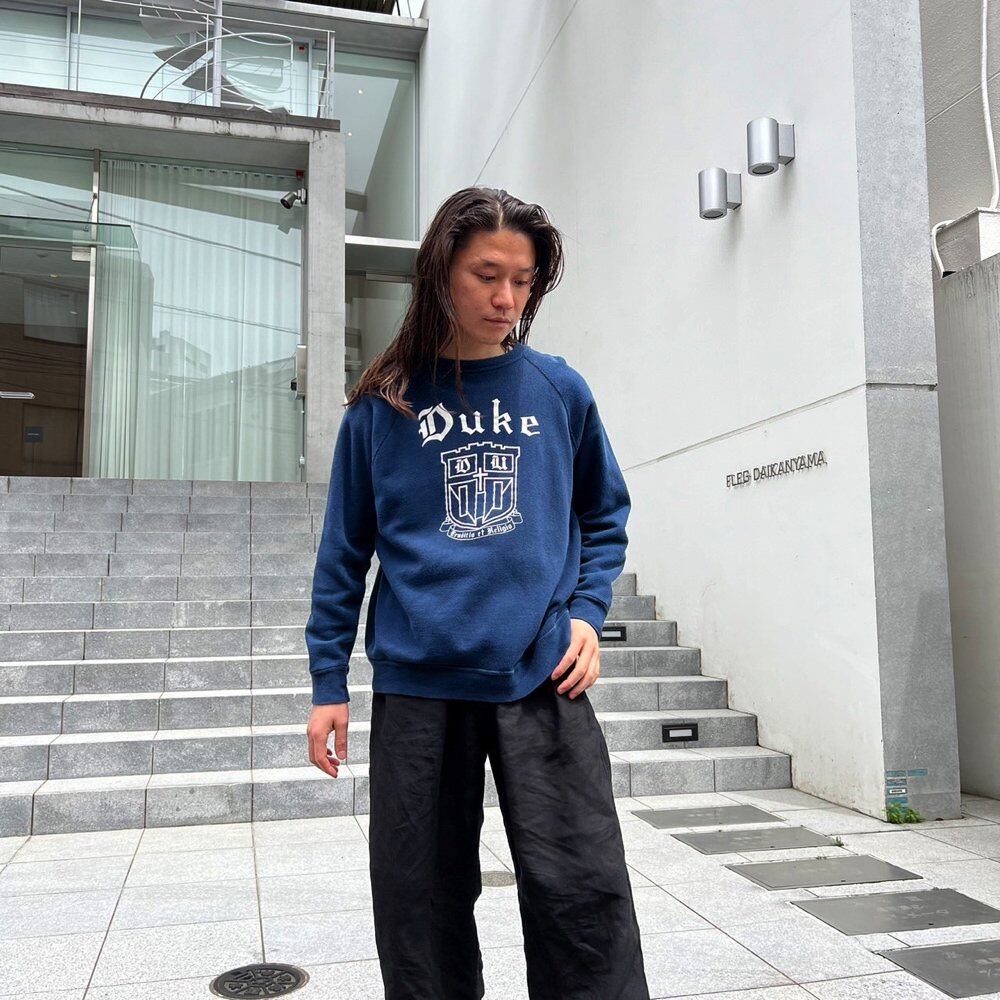 A college sweatshirt from Duke University in the 70s. The sweatshirt fabric has become soft and worn over time, making it a comfortable piece to wear. The navy color has a nice faded look with a white emblem print. The size is XL, and it is a vintage sweatshirt with a good fit and a good sense of roominess.