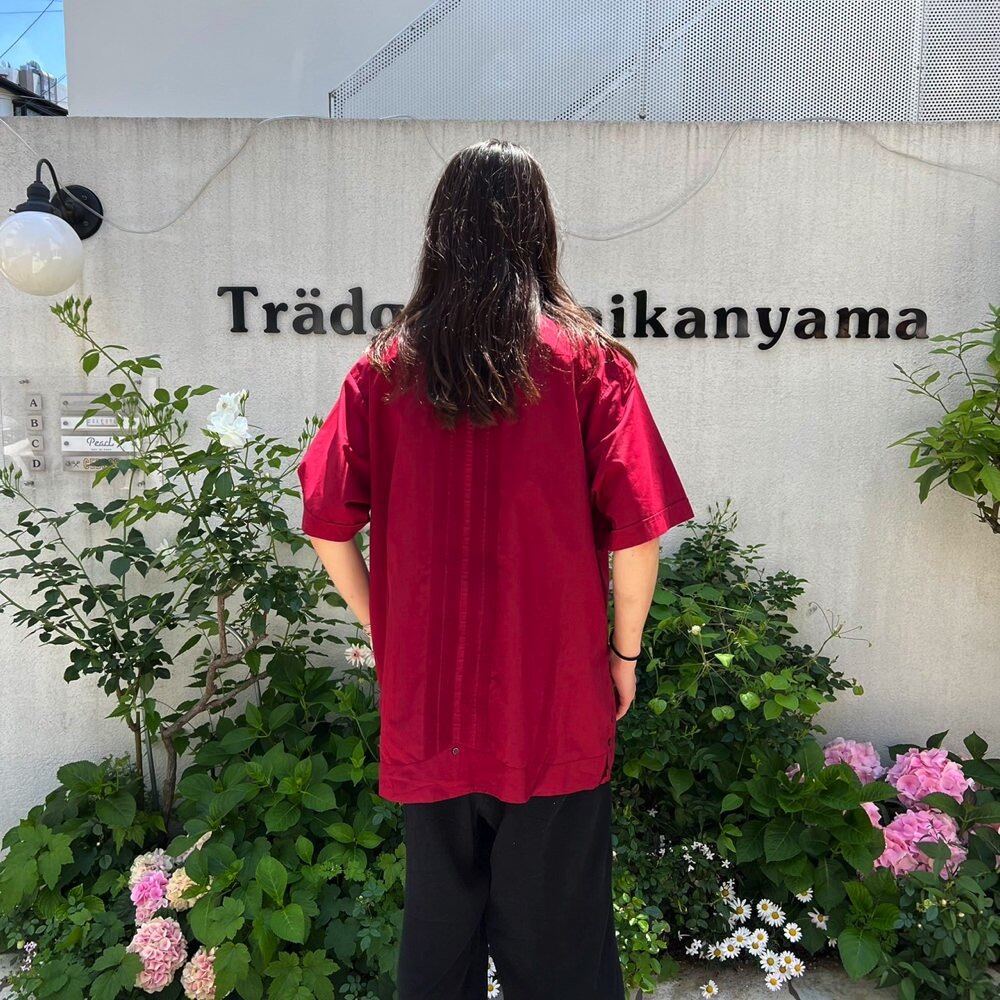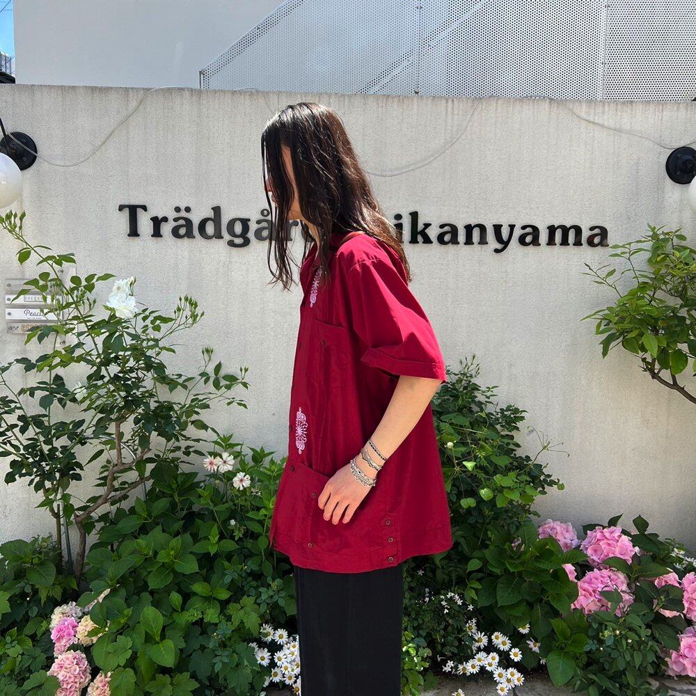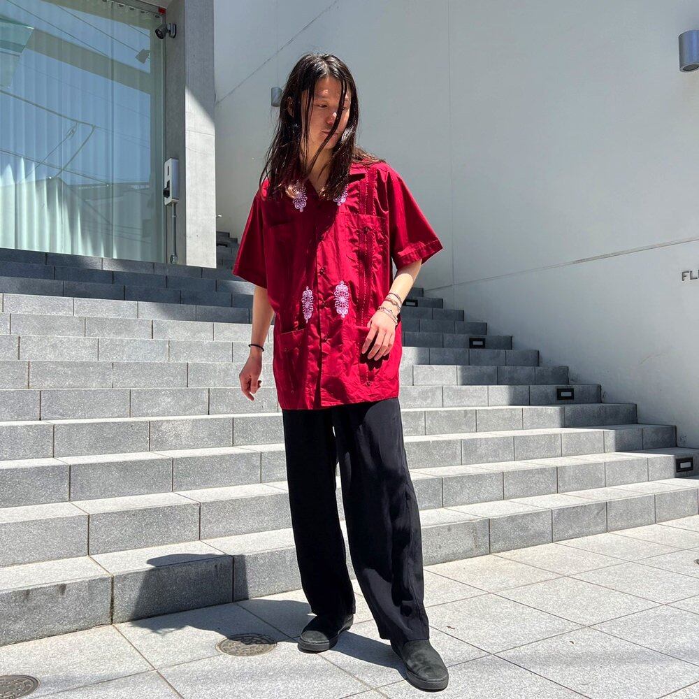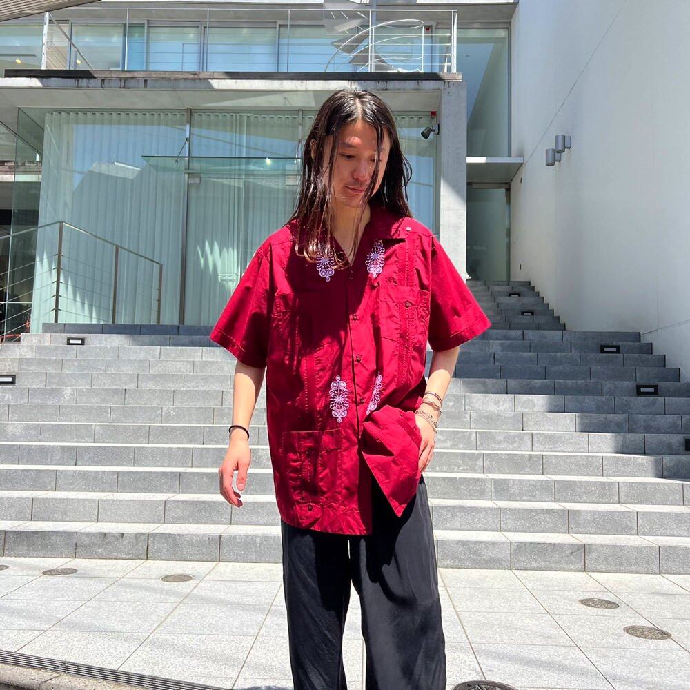 A short-sleeved Cuban shirt from the 80s. A masculine burgundy color with an embroidered design. A lightweight polyester/cotton fabric with a smooth feel. The size is XL. The loose, oversized silhouette makes it suitable for use as a shirt jacket in the summer.