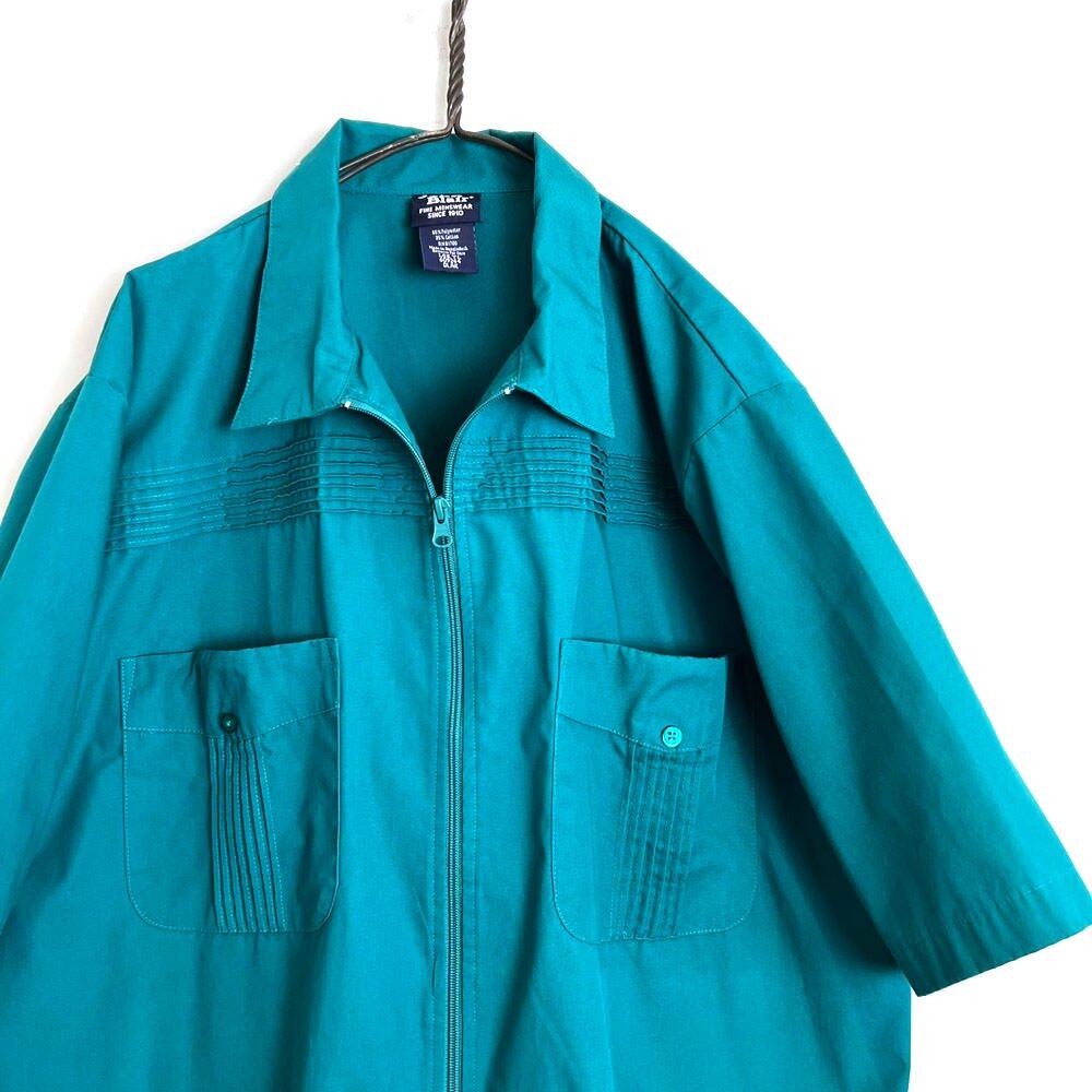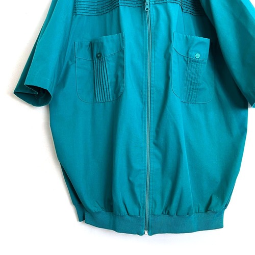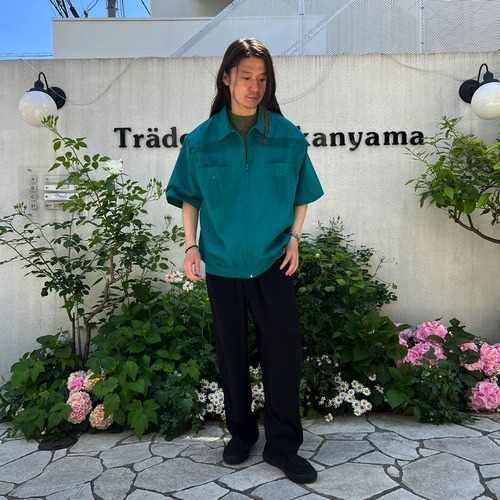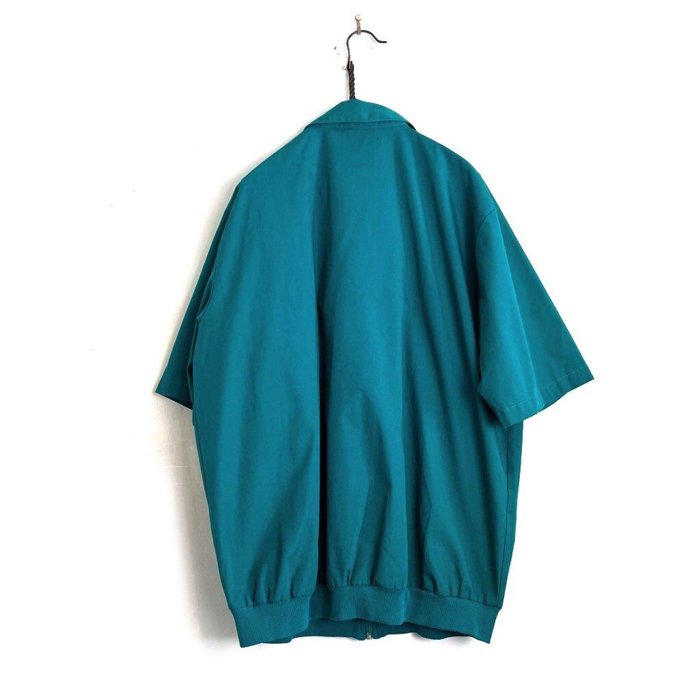A short-sleeve Cuban shirt from the 90s. Sporty front zip design with a refreshing vibrant blue-green color. Made of polyester and cotton, this shirt is light and smooth to the touch. It has a relaxed silhouette and can also be used as a shirt jacket in the summer.