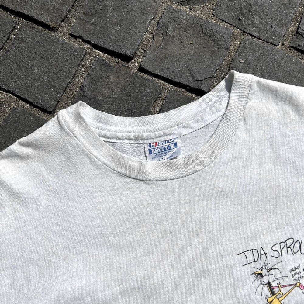 College T-shirt from 1990. This commemorative T-shirt is named after the first president of the University of California and features one of the three dorms. The comic-style design says that my dorm is better than yours, giving it a humorous look. The overall aging gives it a nice vintage feel. XL size with a loose silhouette. Since it is an old item, it may have aged slightly. Please check the photos and understand the characteristics of vintage items before purchasing.