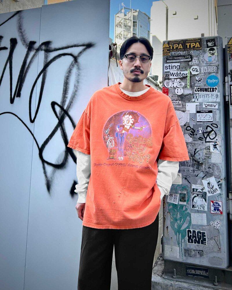 A Betty Boop print T-shirt from the early 2000s. The design features a hitchhiker with a gas tank under his arm, and the lettering gives it an American feel. The orange body has a nice aged look, making it a memorable piece. One size fits all, with a loose silhouette. As this is an old item, it may have aged slightly. Please check the photos and understand the characteristics of vintage items before purchasing.