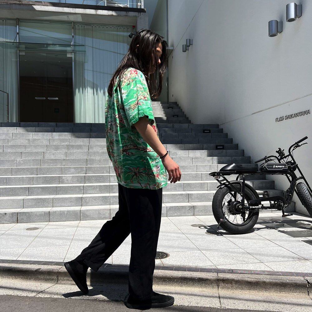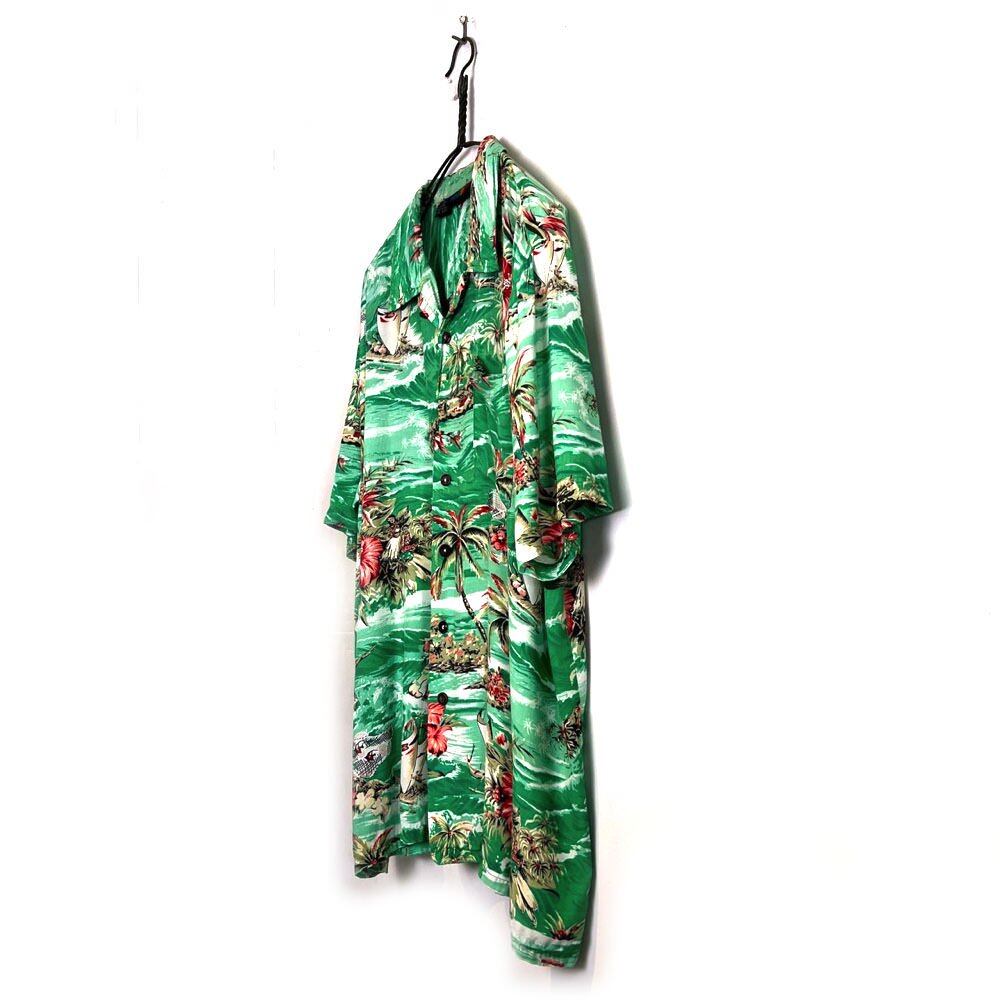 A rayon Hawaiian shirt from the 90s. The vibrant green color is eye-catching, and the soft drape of 100% rayon makes it comfortable to wear. The size is L, and it has a relaxed silhouette that is just the right amount of looseness.