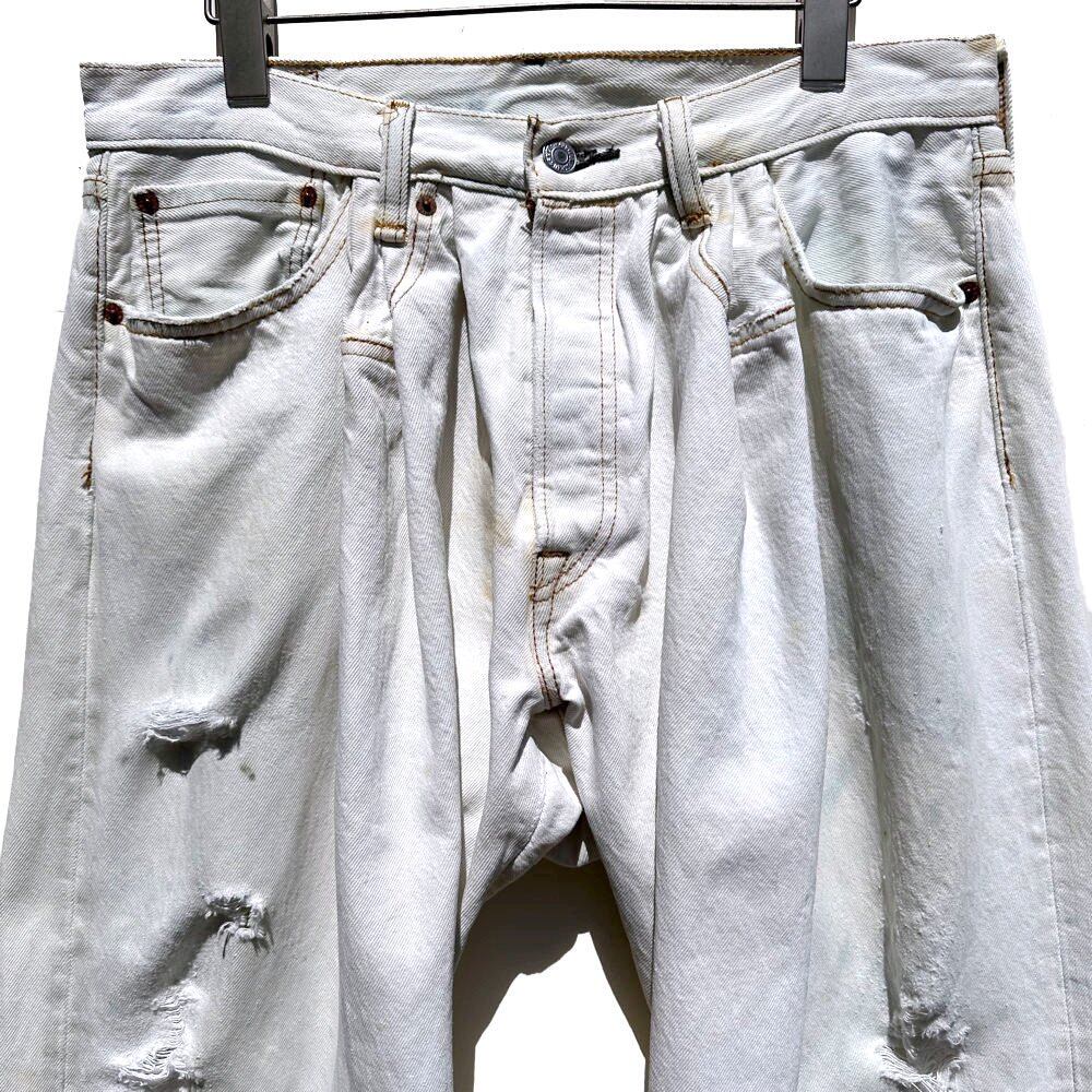 The blue denim is white bleached to create an uneven texture and a tasteful white color.