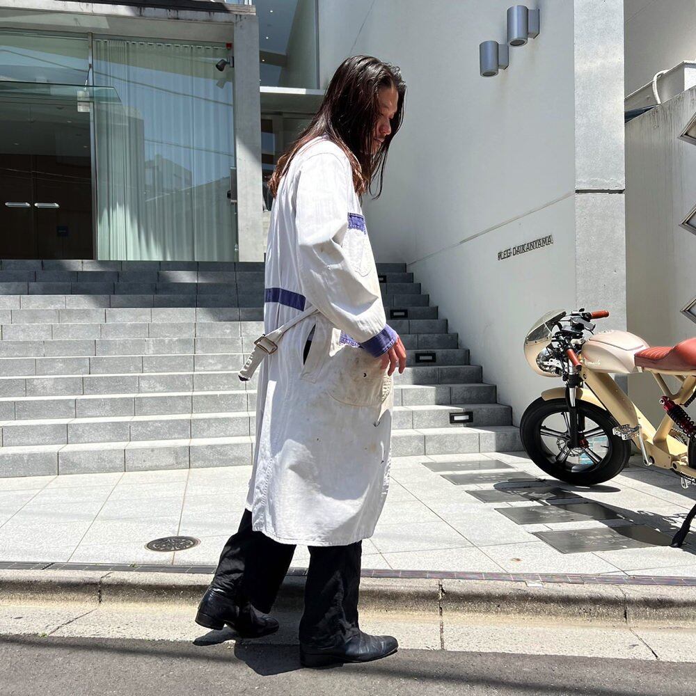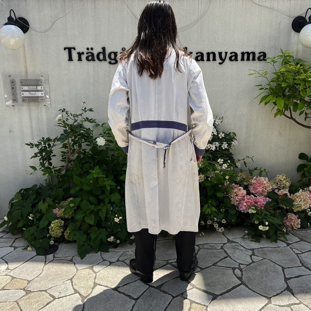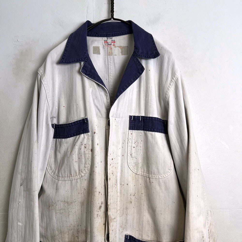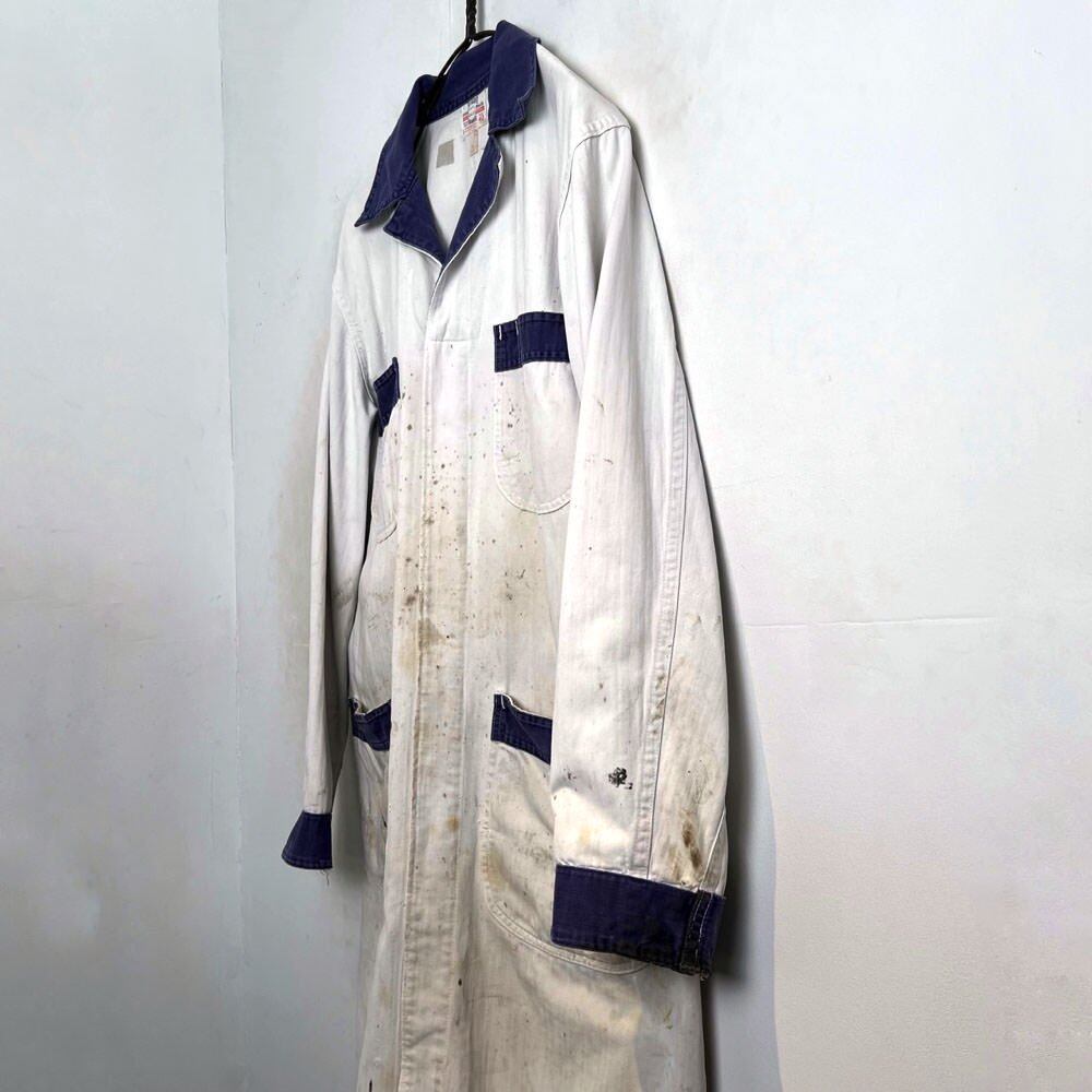 This is a shop coat from the 50s. It has a great atmosphere with the dirt and texture of the fabric that is unique to real workwear. The size is L size 40, and it has a good fit with a moderate amount of room. It has a good silhouette among vintage work coats.