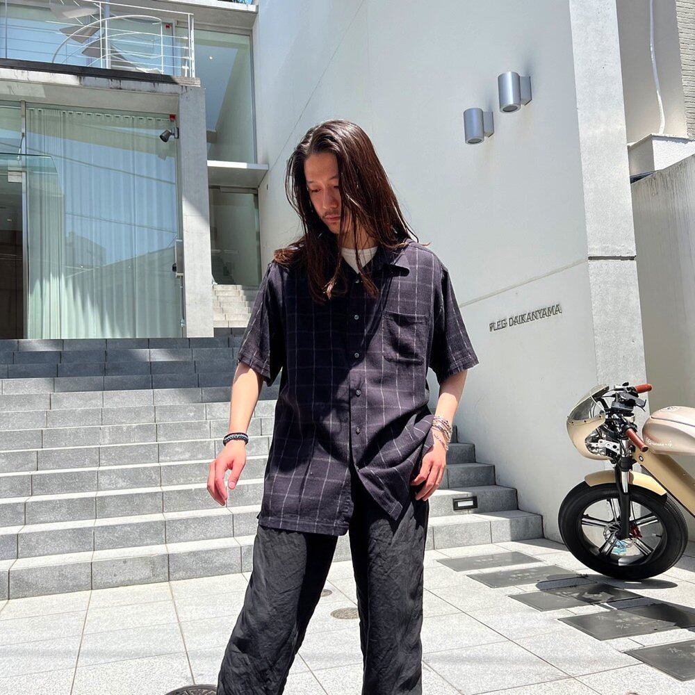 A short-sleeved shirt from the 90s. Made from seersucker fabric with a soft, fluffy texture of cotton and rayon, perfect for summer. The black and white windowpane check pattern is easy to match with other items. A vintage shirt with a good silhouette and a moderately loose fit.